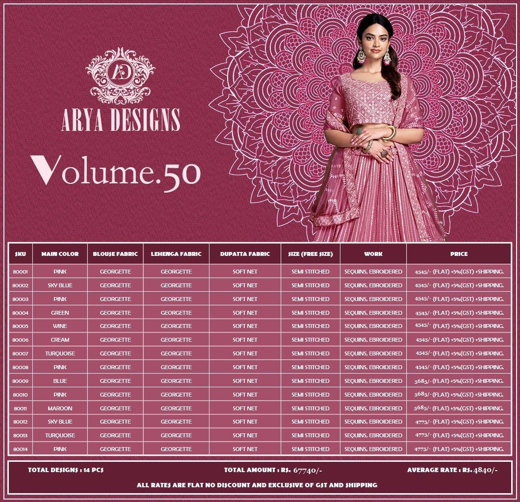 Buy Online Arya Designs New Volume 50 Georgette Work Lehenags 14 Pcs of Full Catalogue at Wholesale Price. Looking for Arya Designs New Volume 50 Georgette Work Lehenags Full Catalouge at Best Price? Buy Now Arya Designs New Volume 50 Georgette Work Lehenags at Wholesale Rate of Rs 67760 with Total 14 Pcs from authroized dealer and supplier of Brand. Cost of Each piece is just only Rs 4840 which is very low and affordable price to resale the product in your retail store ,This is Surat based Wholesale Supplier & Dealer of Brand. Click on Brand name to Know more about Brand's products.Call or Whatsapp on 9898838984 for booking or enquiry