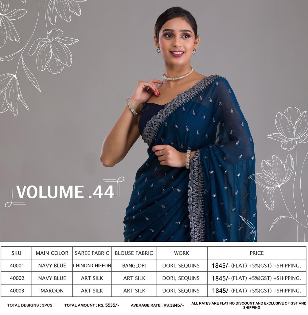 Buy Online Arya Designs Vol 44 Designer Sarees Collection 3 Pcs of Full Catalogue at Wholesale Price. Looking for Arya Designs Vol 44 Designer Sarees Collection Full Catalouge at Best Price? Buy Now Arya Designs Vol 44 Designer Sarees Collection at Wholesale Rate of Rs 5535 with Total 3 Pcs from authroized dealer and supplier of Brand. Cost of Each piece is just only Rs 1845 which is very low and affordable price to resale the product in your retail store ,This is Surat based Wholesale Supplier & Dealer of Brand. Click on Brand name to Know more about Brand's products.Call or Whatsapp on 9898838984 for booking or enquiry