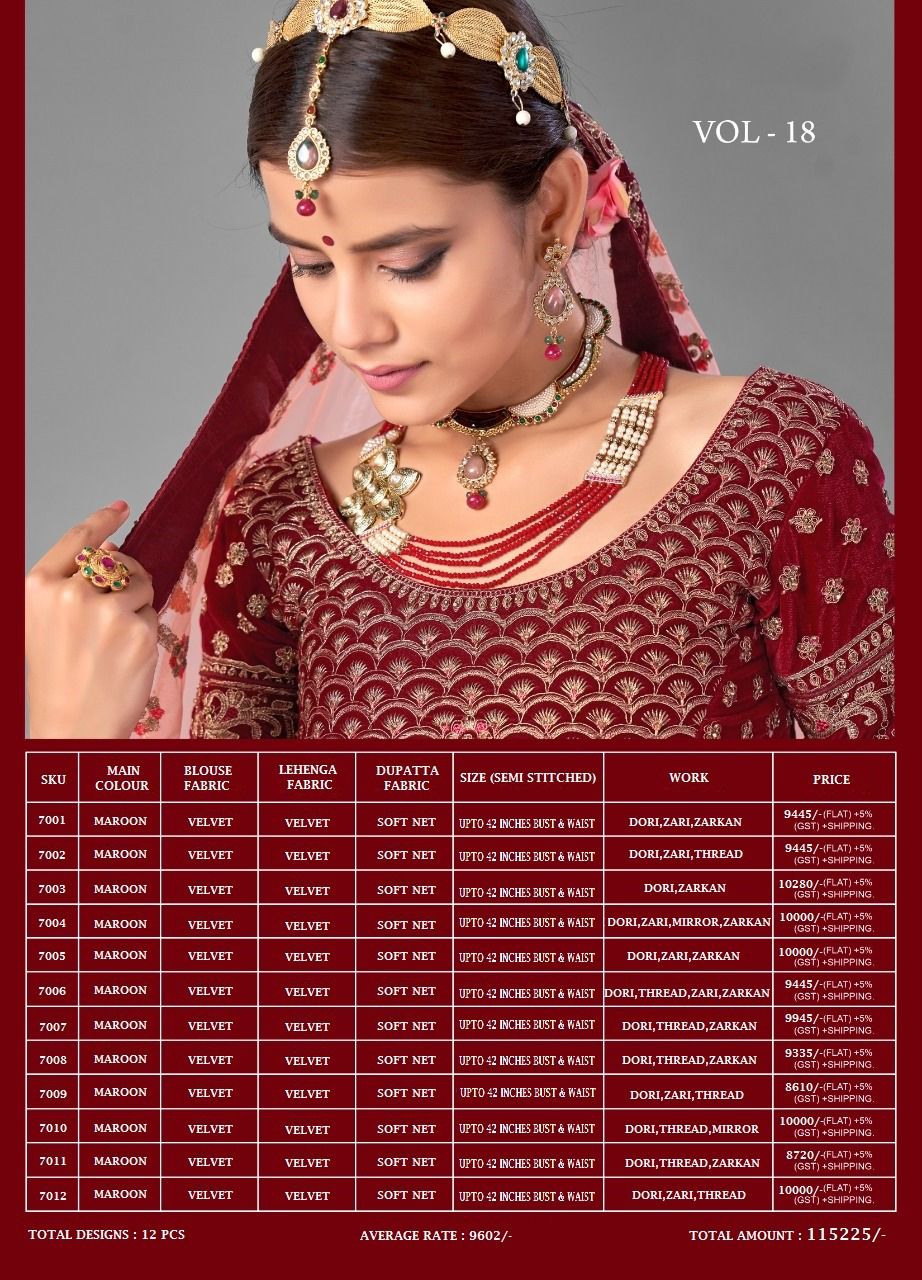 Buy Online Arya Lehanga Vol 18 Series 7001 To 7012 Single And Set Stockiest And Supplier From Surat 12 Pcs of Full Catalogue at Wholesale Price. Looking for Arya Lehanga Vol 18 Series 7001 To 7012 Single And Set Stockiest And Supplier From Surat Full Catalouge at Best Price? Buy Now Arya Lehanga Vol 18 Series 7001 To 7012 Single And Set Stockiest And Supplier From Surat at Wholesale Rate of Rs 115224 with Total 12 Pcs from authroized dealer and supplier of Brand. Cost of Each piece is just only Rs 9602 which is very low and affordable price to resale the product in your retail store ,This is Surat based Wholesale Supplier & Dealer of Brand. Click on Brand name to Know more about Brand's products.Call or Whatsapp on 9898838984 for booking or enquiry