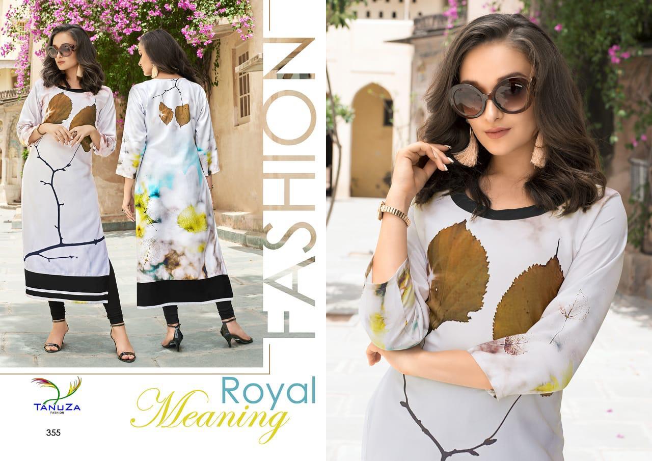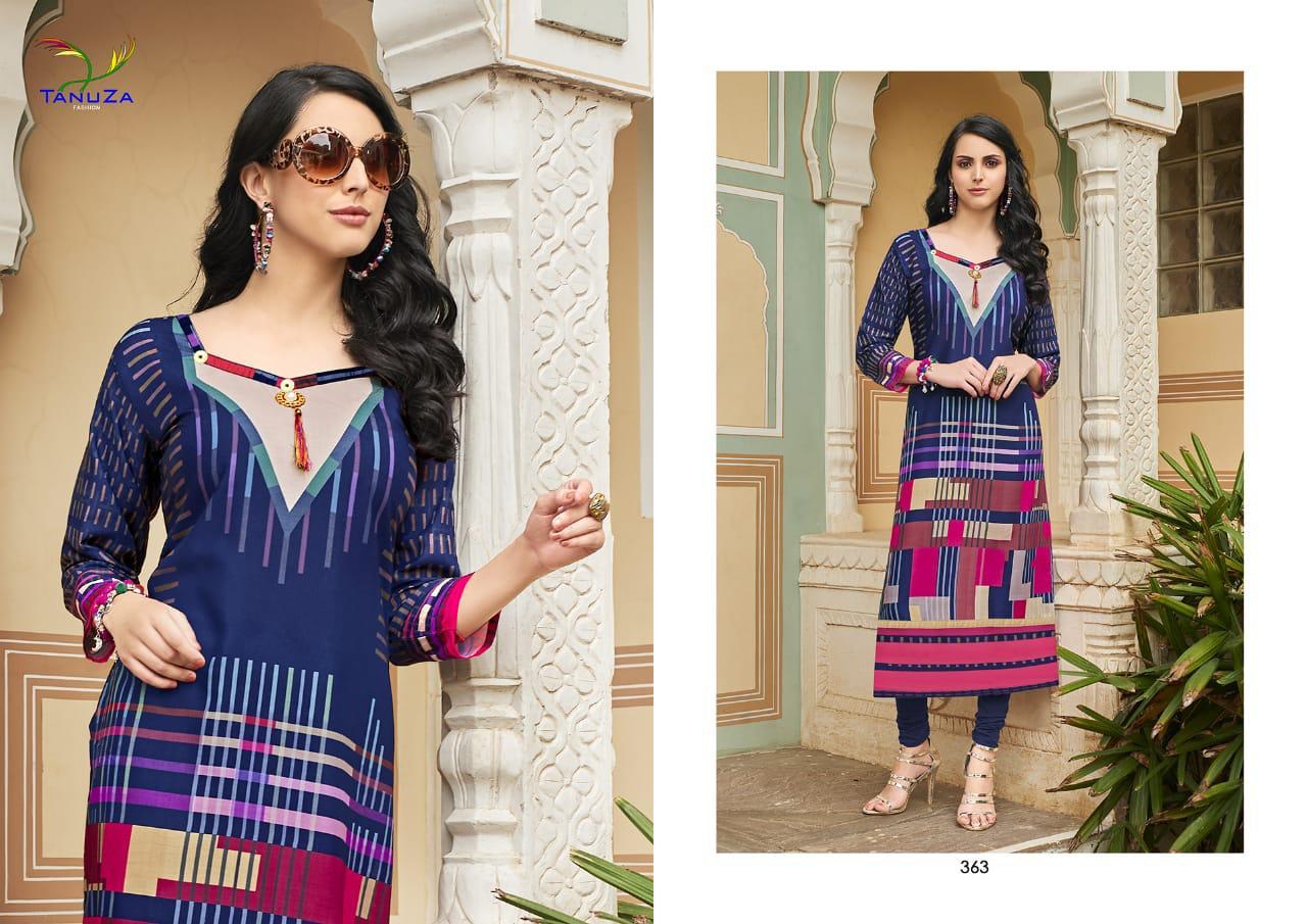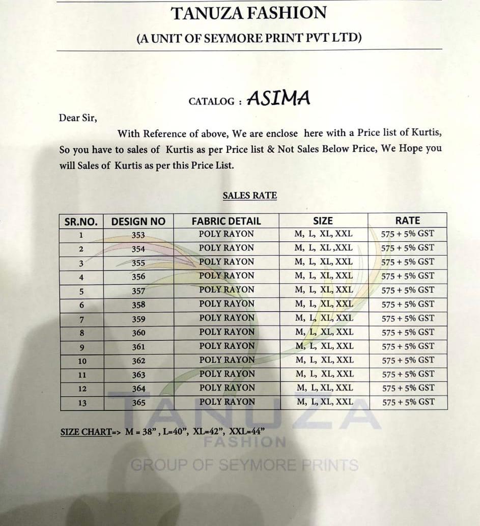 Buy Online Asima By Tanuja 353 Series Fancy Poly Reyon Printed Kurti Catlog Wholesaler Surat 13 Pcs of Full Catalogue at Wholesale Price. Looking for Asima By Tanuja 353 Series Fancy Poly Reyon Printed Kurti Catlog Wholesaler Surat Full Catalouge at Best Price? Buy Now Asima By Tanuja 353 Series Fancy Poly Reyon Printed Kurti Catlog Wholesaler Surat at Wholesale Rate of Rs 7475 with Total 13 Pcs from authroized dealer and supplier of TANUJA Brand. Cost of Each piece is just only Rs 575 which is very low and affordable price to resale the product in your retail store ,This is Surat based Wholesale Supplier & Dealer of TANUJA Brand. Click on Brand name to Know more about TANUJA Brand's products.Call or Whatsapp on 9898838984 for booking or enquiry