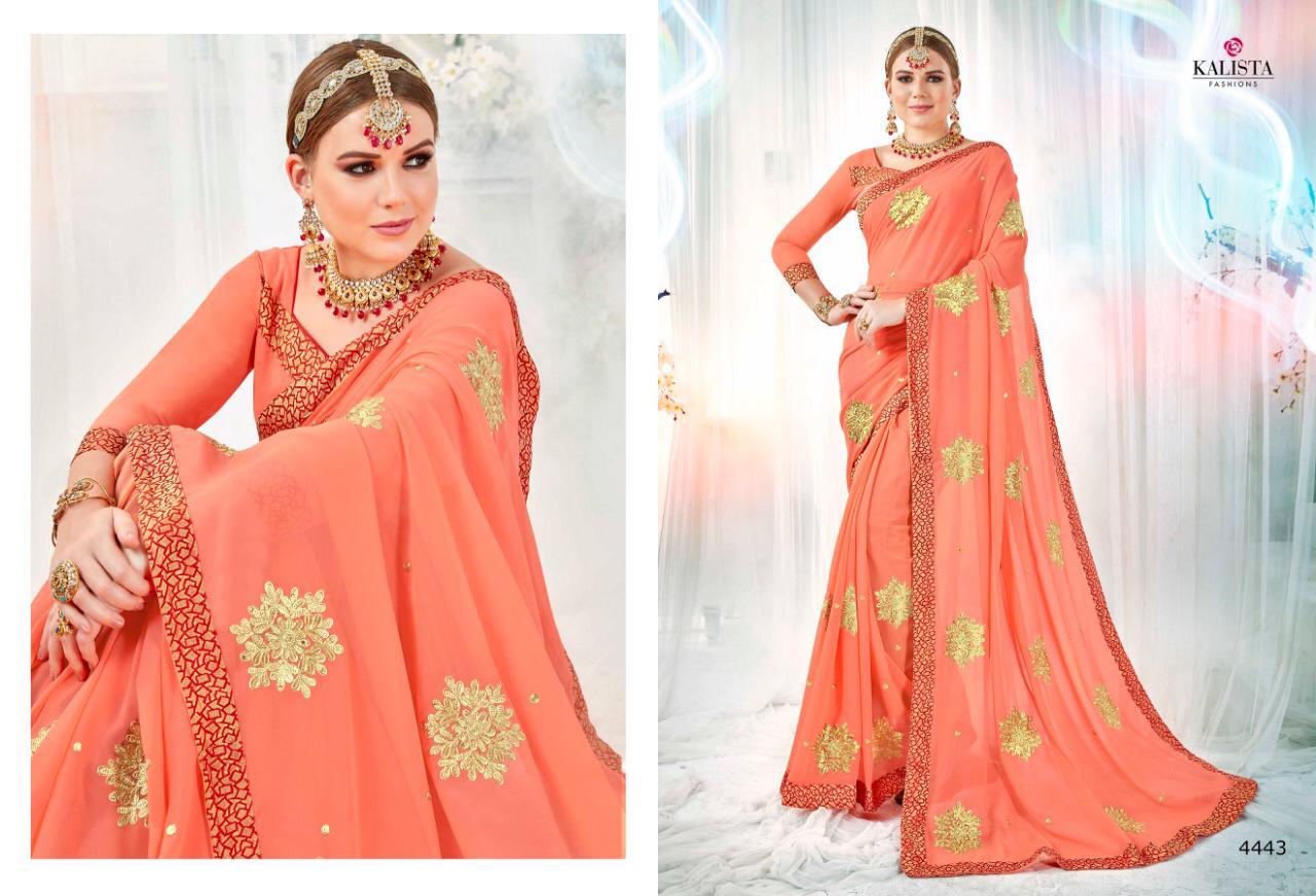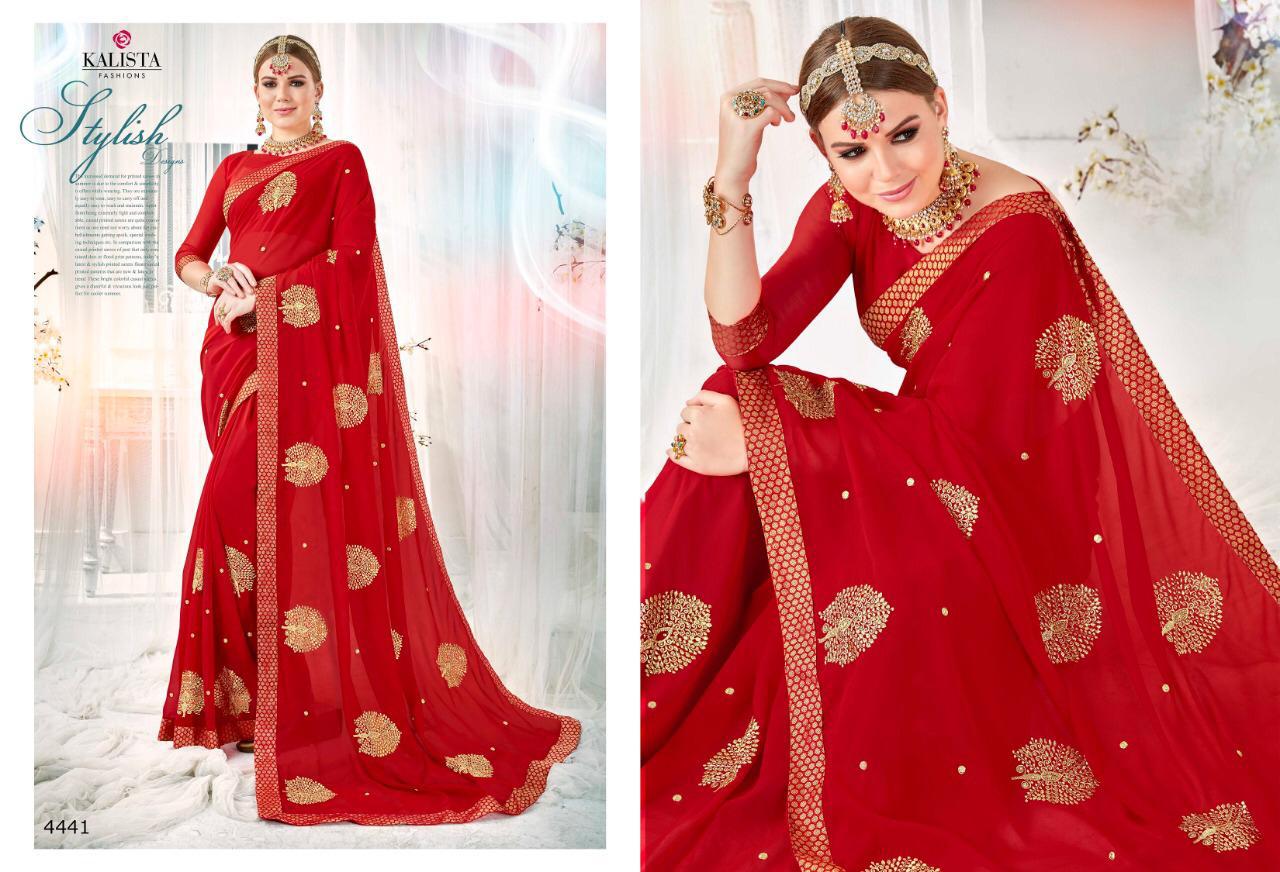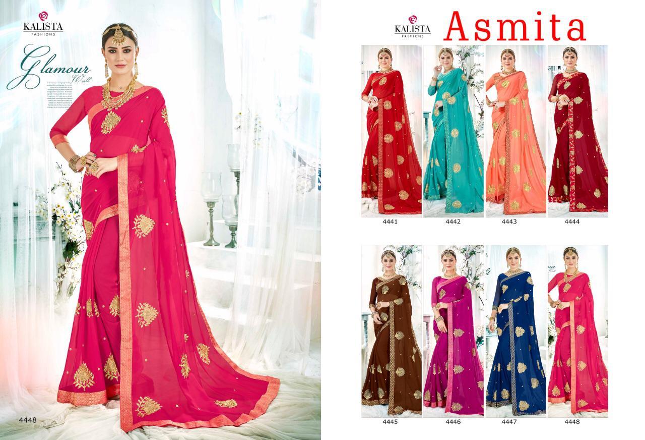 Buy Online Asmita By Kalista Series 4441 Fancy Designer Party Wear Sarees Wholesale Supplier Gujarat 8 Pcs of Full Catalogue at Wholesale Price. Looking for Asmita By Kalista Series 4441 Fancy Designer Party Wear Sarees Wholesale Supplier Gujarat Full Catalouge at Best Price? Buy Now Asmita By Kalista Series 4441 Fancy Designer Party Wear Sarees Wholesale Supplier Gujarat at Wholesale Rate of Rs 5400 with Total 8 Pcs from authroized dealer and supplier of KALISTA FASHION Brand. Cost of Each piece is just only Rs 675 which is very low and affordable price to resale the product in your retail store ,This is Surat based Wholesale Supplier & Dealer of KALISTA FASHION Brand. Click on Brand name to Know more about KALISTA FASHION Brand's products.Call or Whatsapp on 9898838984 for booking or enquiry