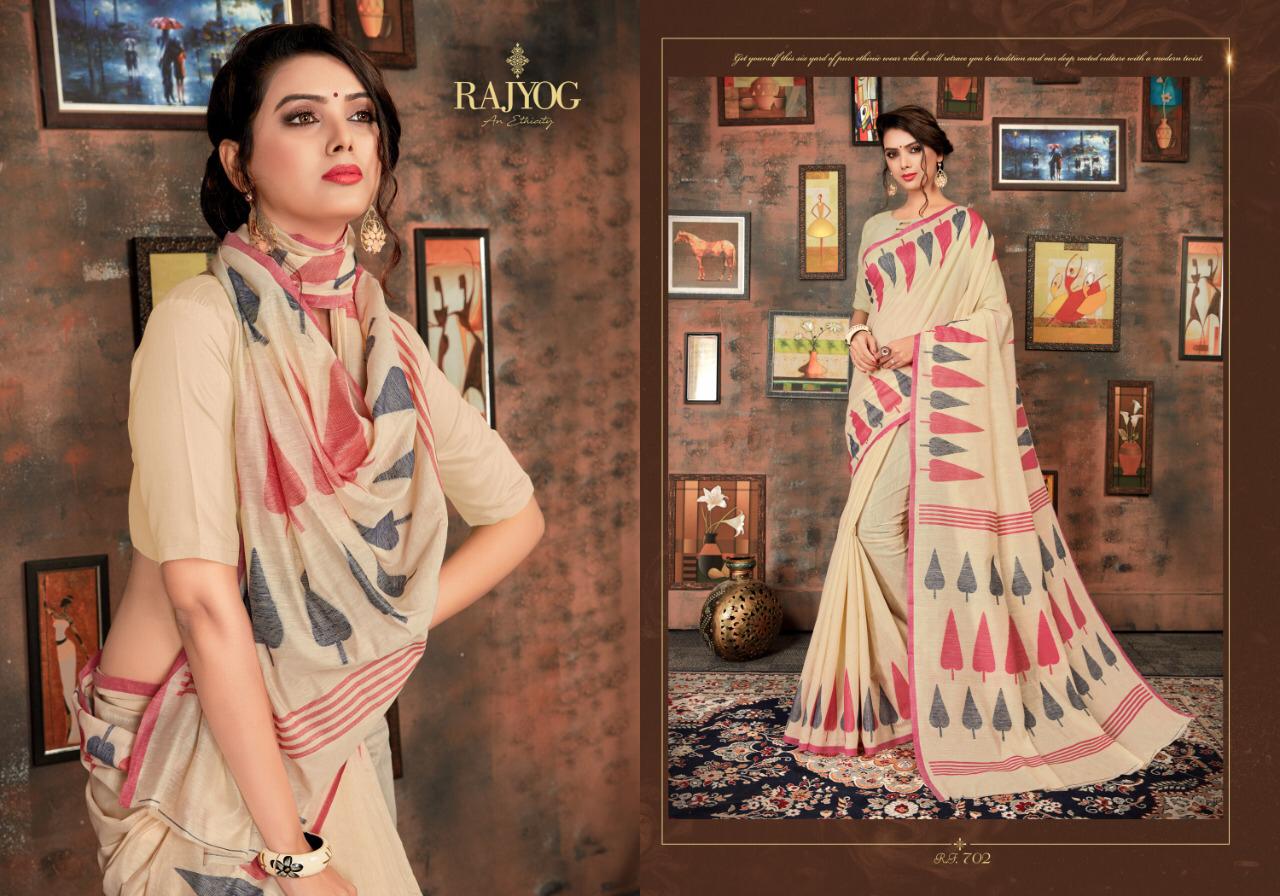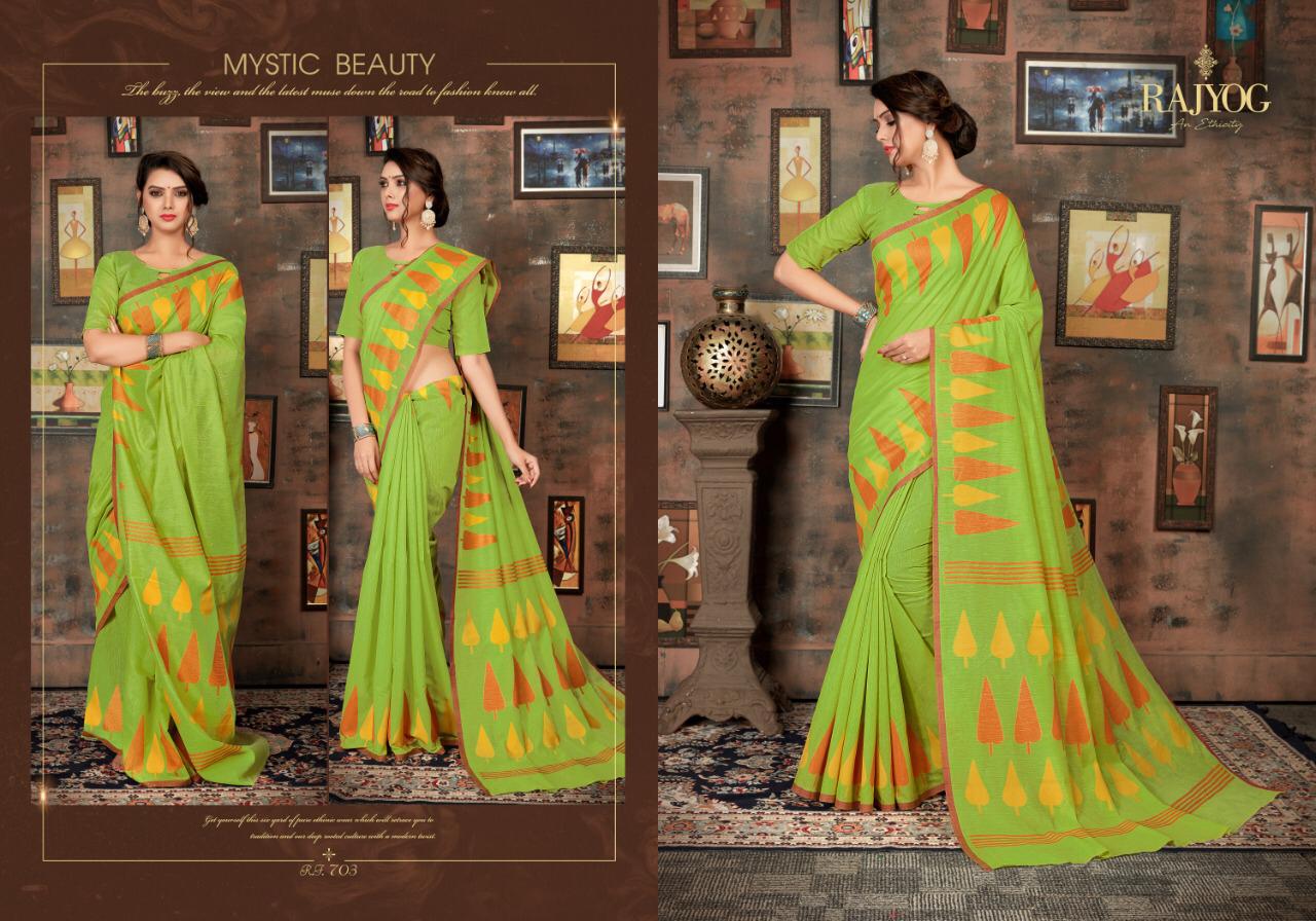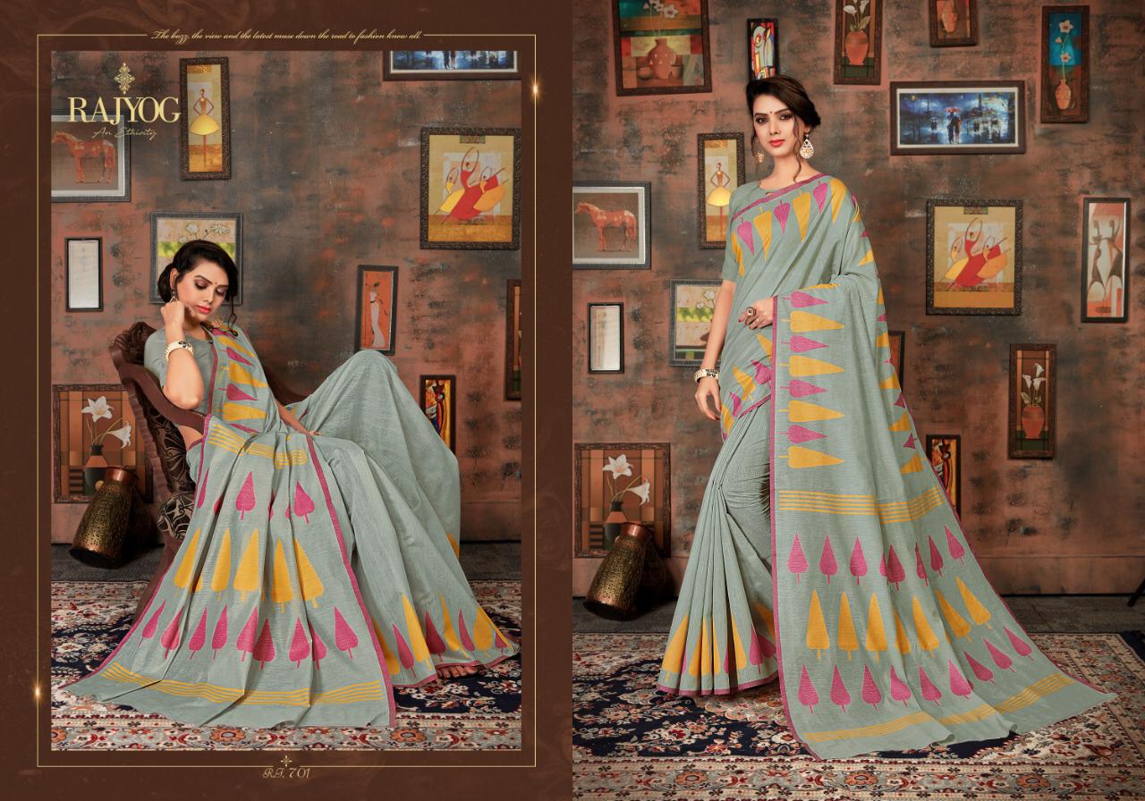 Dear Customer, We are launching our new Catalog Brand:- *RAJYOG* Catlogue :-*Asopalav silk* Series :- 701 to 705 Fabric detail :- *Soft cotton* Rate :- *755/-* per pcs Gst :- 5% extra *SET & LOOSE & MULTIPLE* Book your order nowÂ?. Delivery- Running |