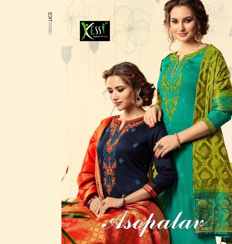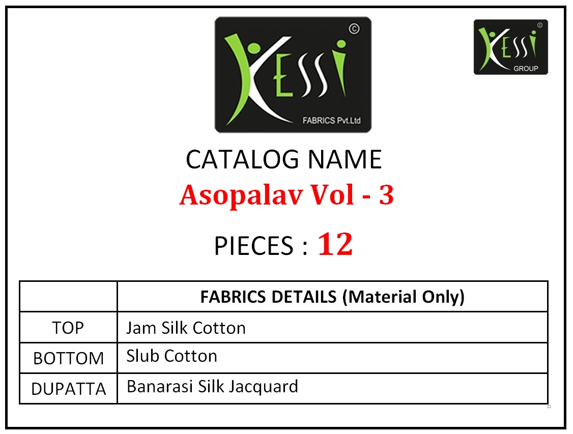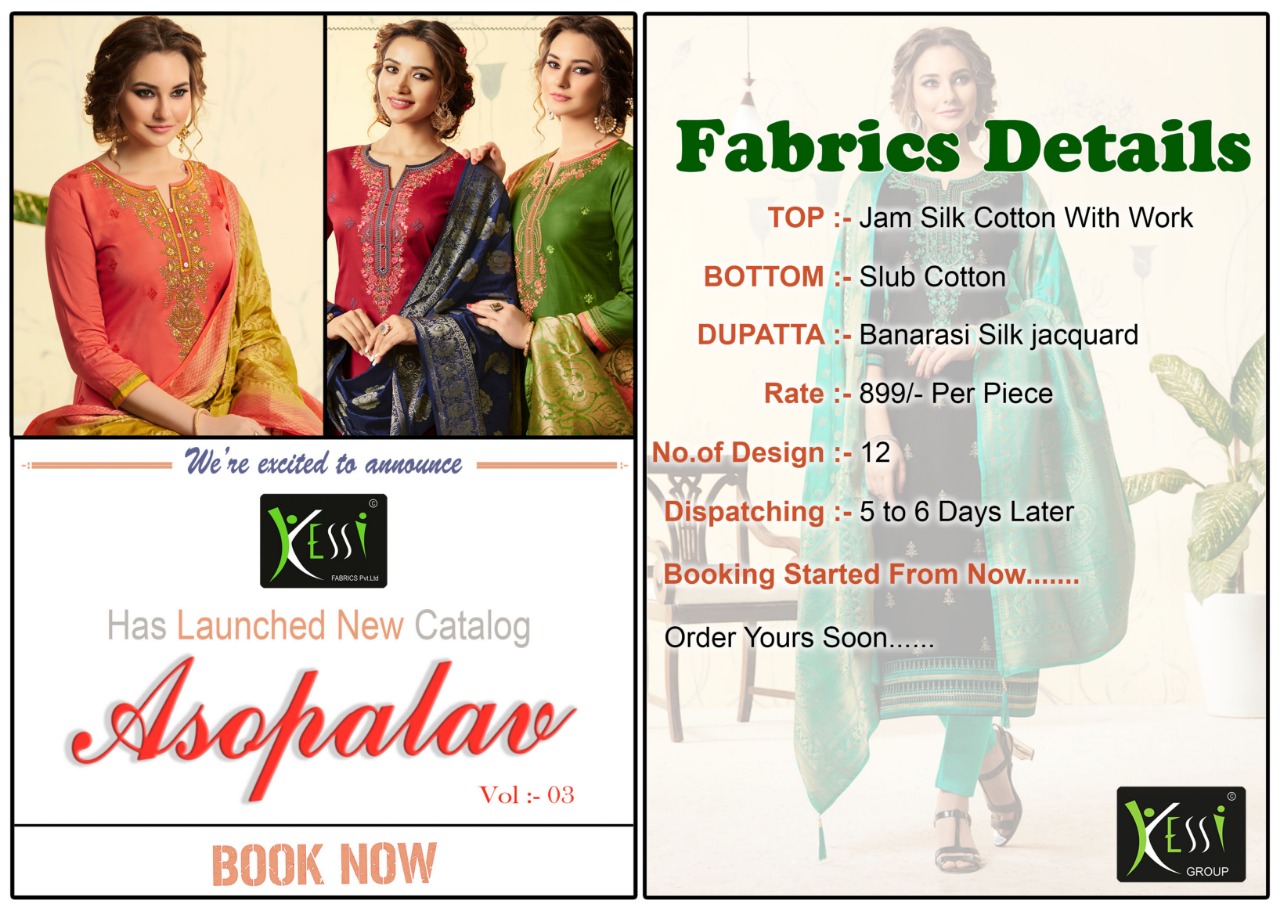 ? *Kessi Fabrics Pvt. Ltd.* has launched _Catalog name_ : *Asopalav Vol - 3* ? _Fabric Details_ ? ?Top :- Jam Silk Cotton ?Bottom:- Slub Cotton ?Dupatta:- Banarasi Silk Jacquard ?Total Design :- 12 ?Dispatching 5 to 6 days later ?Booking started from now... ?Order yours soon.... Rate -899 per Pcs . Set to set. GST 5 Percent Extra. |