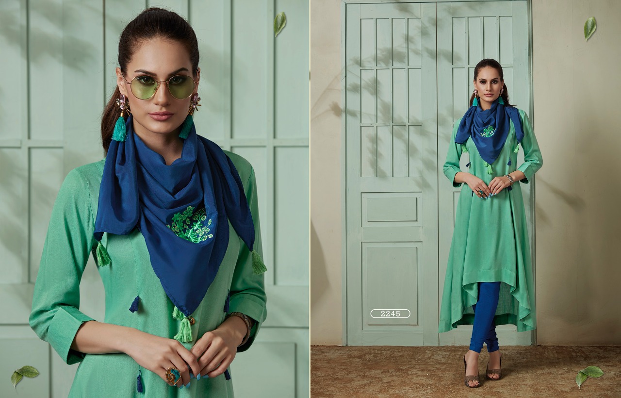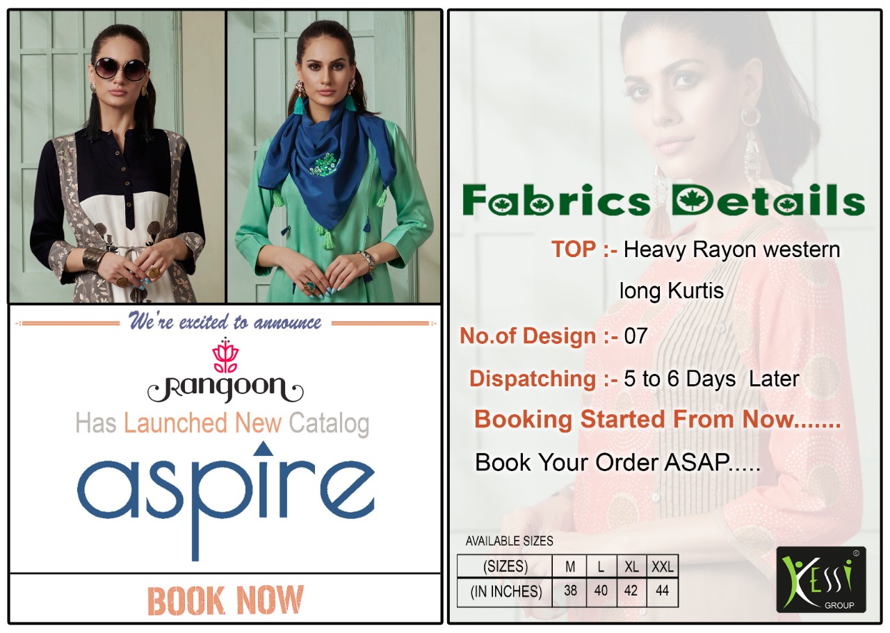 ? *Rangoon (Kessi Fabrics Pvt. Ltd.)* has launched _Catalog name_ : *Aspire* ? _Fabric Details_ ? ?Top:- Heavy Rayon Western Long Kurtis ?Total Design:- 7 ?Size;- M, L, XL, XXL Rate 499 Gst extra |