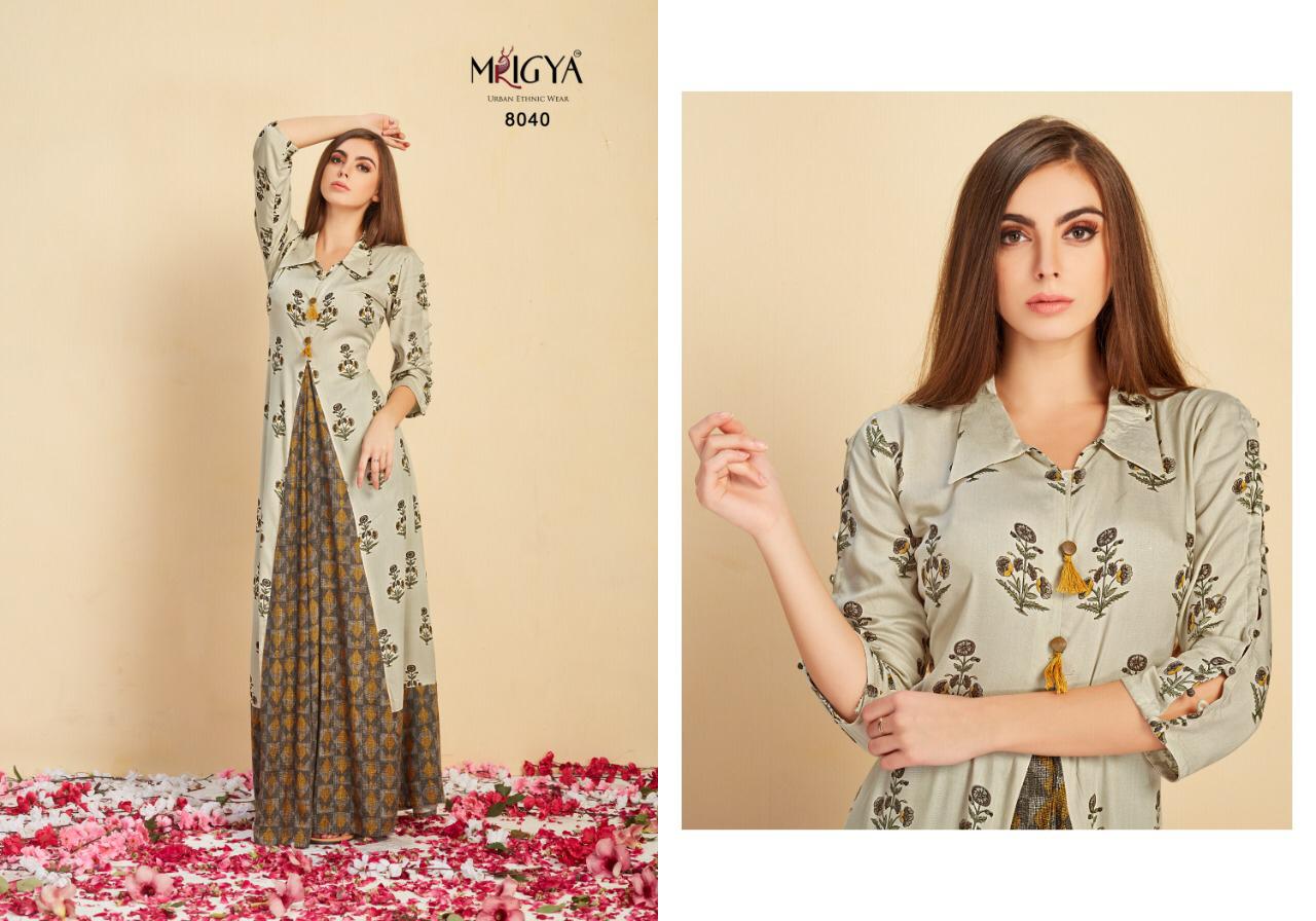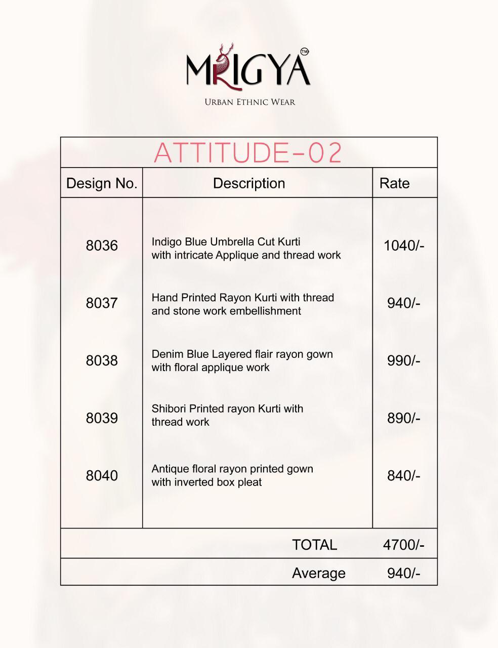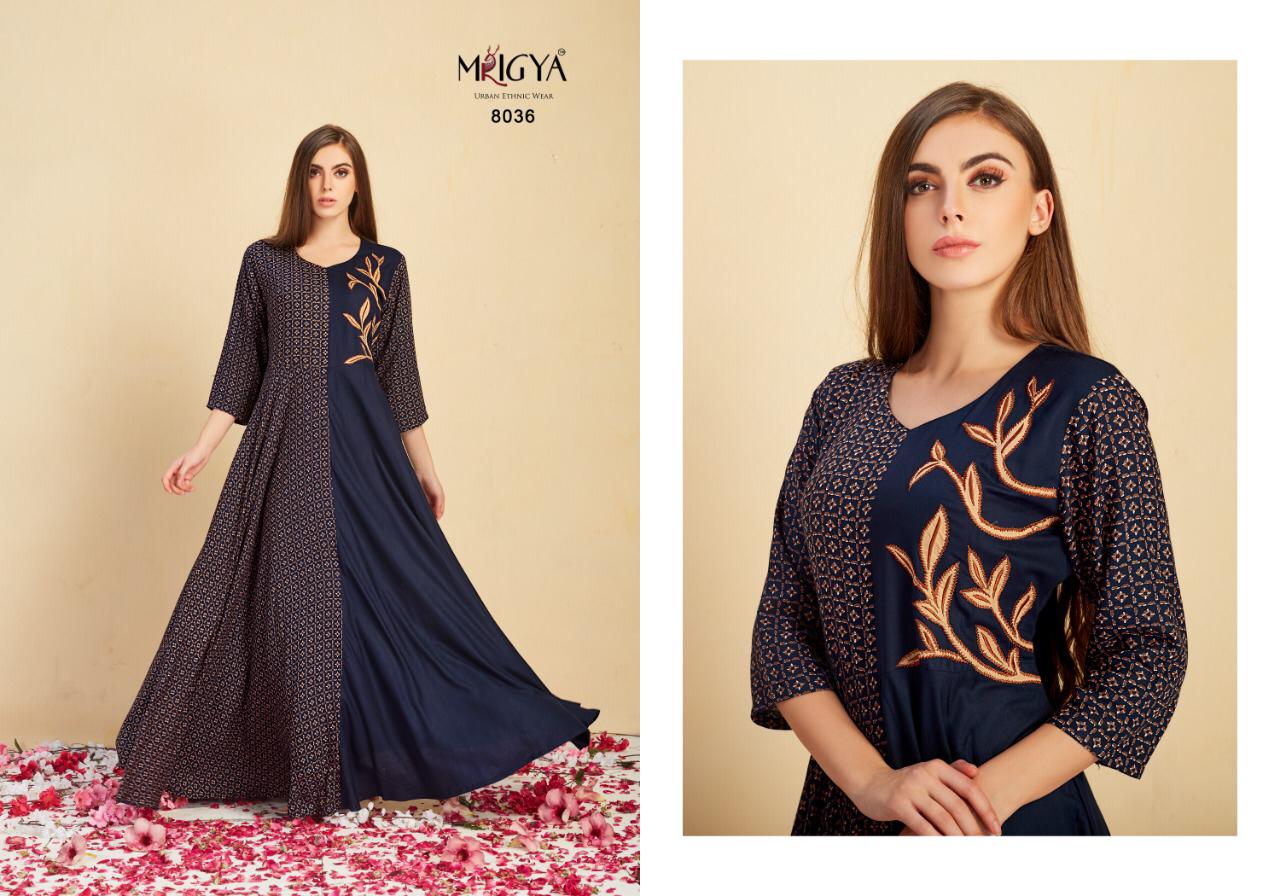 Buy Online Attitude Vol 2 By Mrigya 8036 Series Fancy Designer Gown Style Kurti Catlog Wholesale Dealer Surat 6 Pcs of Full Catalogue at Wholesale Price. Looking for Attitude Vol 2 By Mrigya 8036 Series Fancy Designer Gown Style Kurti Catlog Wholesale Dealer Surat Full Catalouge at Best Price? Buy Now Attitude Vol 2 By Mrigya 8036 Series Fancy Designer Gown Style Kurti Catlog Wholesale Dealer Surat at Wholesale Rate of Rs 5640 with Total 6 Pcs from authroized dealer and supplier of MRIGYA Brand. Cost of Each piece is just only Rs 940 which is very low and affordable price to resale the product in your retail store ,This is Surat based Wholesale Supplier & Dealer of MRIGYA Brand. Click on Brand name to Know more about MRIGYA Brand's products.Call or Whatsapp on 9898838984 for booking or enquiry