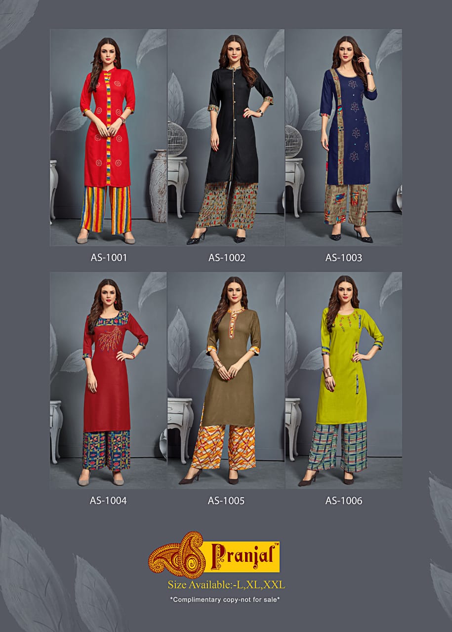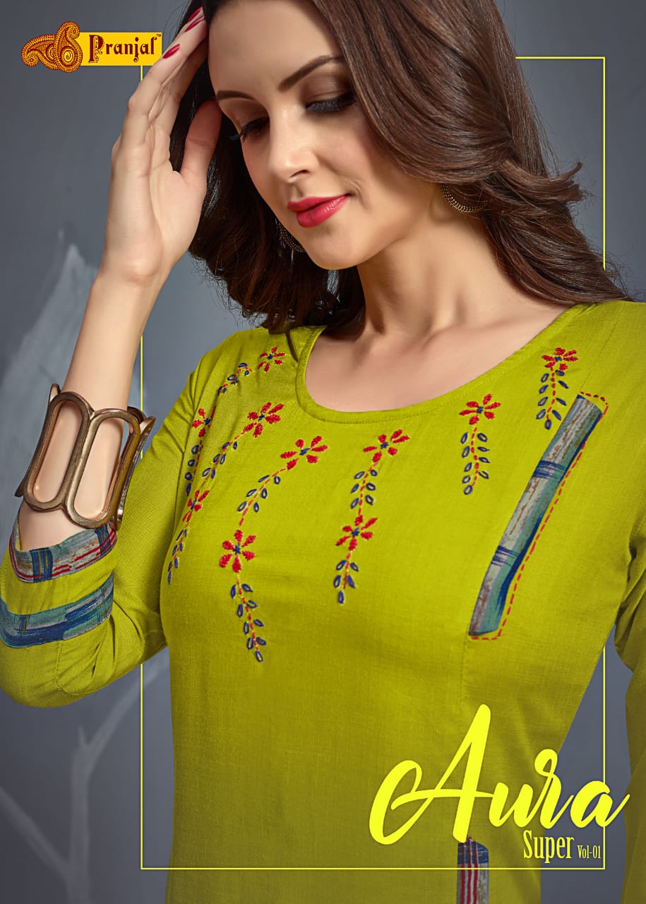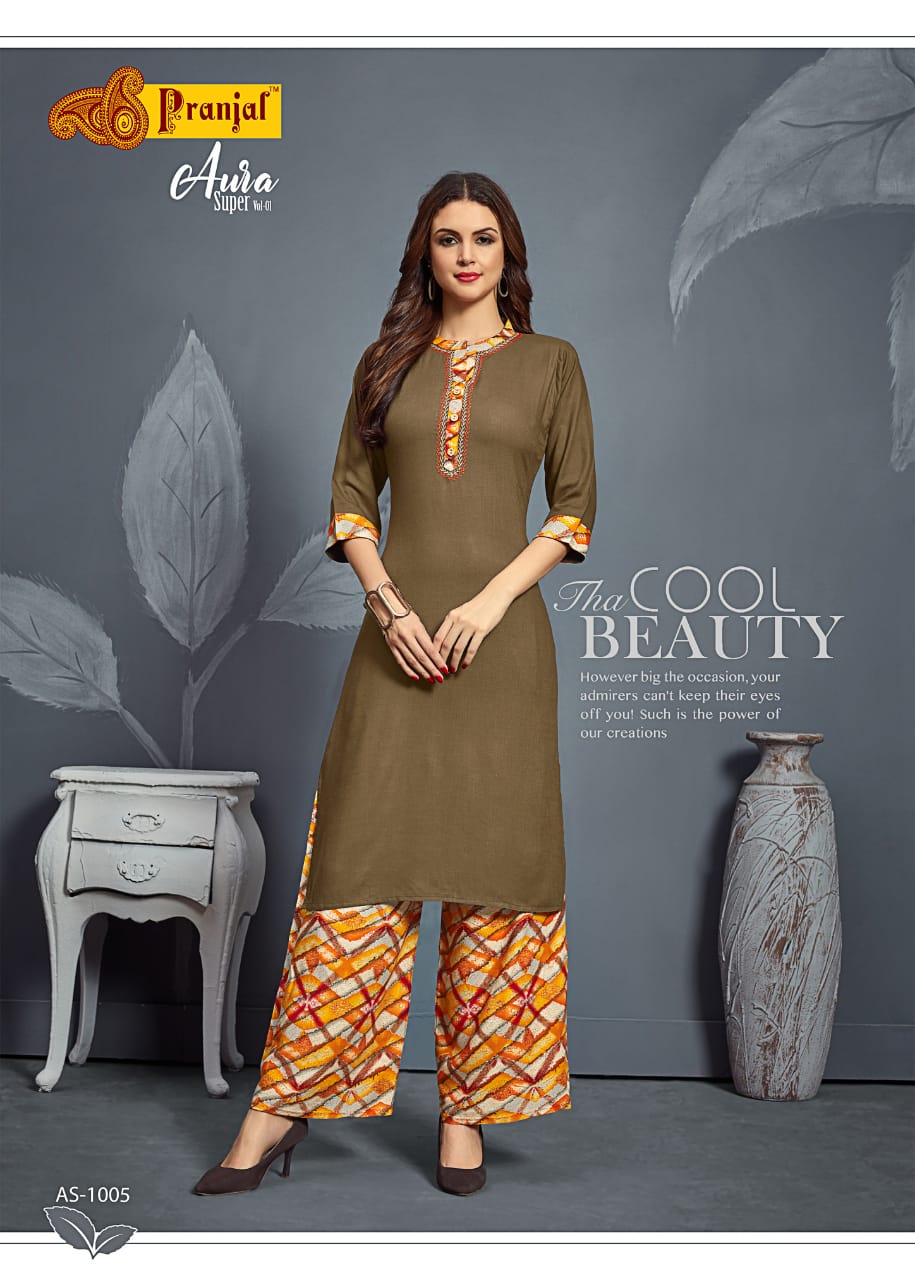 Buy Online Aura Super Vol 1 By Pranjal Kurtis With Plazzo Wholesale Supplier Nd Dealer Gujarat 6 Pcs of Full Catalogue at Wholesale Price. Looking for Aura Super Vol 1 By Pranjal Kurtis With Plazzo Wholesale Supplier Nd Dealer Gujarat Full Catalouge at Best Price? Buy Now Aura Super Vol 1 By Pranjal Kurtis With Plazzo Wholesale Supplier Nd Dealer Gujarat at Wholesale Rate of Rs 3540 with Total 6 Pcs from authroized dealer and supplier of Brand. Cost of Each piece is just only Rs 590 which is very low and affordable price to resale the product in your retail store ,This is Surat based Wholesale Supplier & Dealer of Brand. Click on Brand name to Know more about Brand's products.Call or Whatsapp on 9898838984 for booking or enquiry