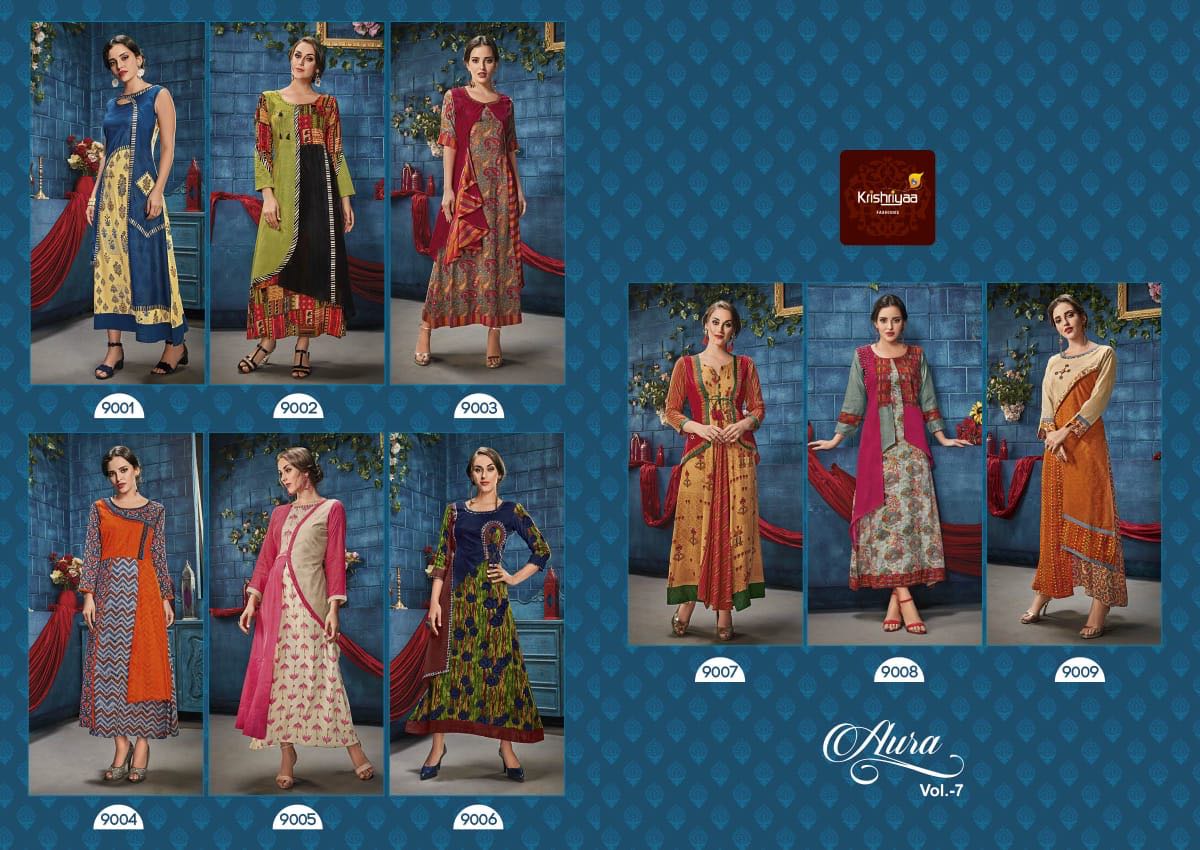Buy Online Aura Vol 7 By Krishriyaa Reyon Festival Wear Kurtis Catalog Wholesale Supplier And Dealer Surat 9 Pcs of Full Catalogue at Wholesale Price. Looking for Aura Vol 7 By Krishriyaa Reyon Festival Wear Kurtis Catalog Wholesale Supplier And Dealer Surat Full Catalouge at Best Price? Buy Now Aura Vol 7 By Krishriyaa Reyon Festival Wear Kurtis Catalog Wholesale Supplier And Dealer Surat at Wholesale Rate of Rs 8100 with Total 9 Pcs from authroized dealer and supplier of KRISHRYAA Brand. Cost of Each piece is just only Rs 900 which is very low and affordable price to resale the product in your retail store ,This is Surat based Wholesale Supplier & Dealer of KRISHRYAA Brand. Click on Brand name to Know more about KRISHRYAA Brand's products.Call or Whatsapp on 9898838984 for booking or enquiry