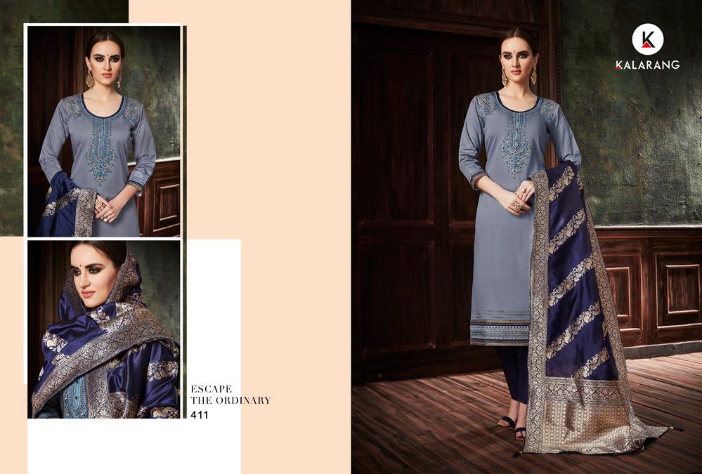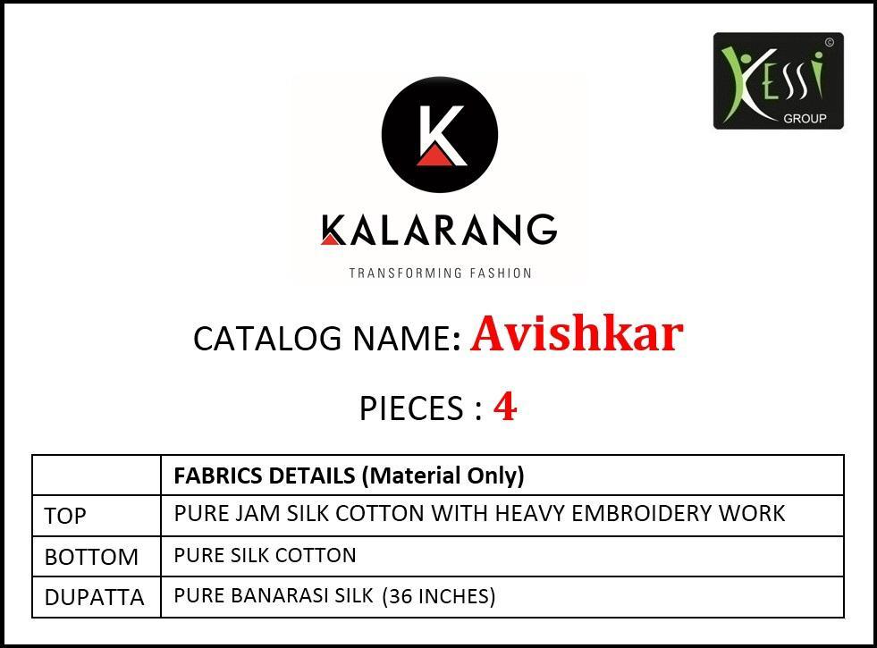 Buy Online Avishkar By Kalarang 411 Series Fancy Pure Jam Silk Cotton Salwar Kameez Catlog Wholesale Dealer Surat 4 Pcs of Full Catalogue at Wholesale Price. Looking for Avishkar By Kalarang 411 Series Fancy Pure Jam Silk Cotton Salwar Kameez Catlog Wholesale Dealer Surat Full Catalouge at Best Price? Buy Now Avishkar By Kalarang 411 Series Fancy Pure Jam Silk Cotton Salwar Kameez Catlog Wholesale Dealer Surat at Wholesale Rate of Rs 3996 with Total 4 Pcs from authroized dealer and supplier of KALARANG Brand. Cost of Each piece is just only Rs 999 which is very low and affordable price to resale the product in your retail store ,This is Surat based Wholesale Supplier & Dealer of KALARANG Brand. Click on Brand name to Know more about KALARANG Brand's products.Call or Whatsapp on 9898838984 for booking or enquiry