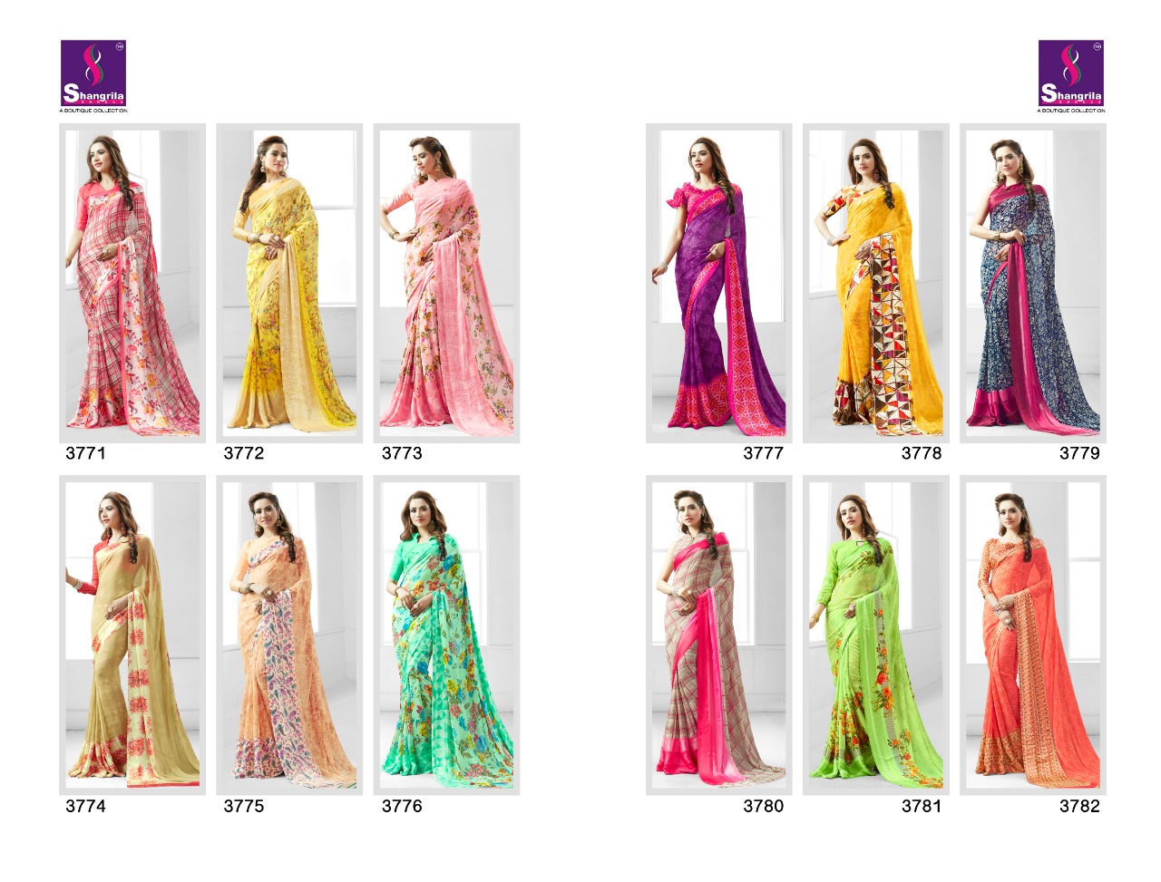 Buy Online Ayaana Vol 2 By Shangrila 3771 Series Fancy Printed Sare With Satin Border Collection Wholesale Dealer Surat 12 Pcs of Full Catalogue at Wholesale Price. Looking for Ayaana Vol 2 By Shangrila 3771 Series Fancy Printed Sare With Satin Border Collection Wholesale Dealer Surat Full Catalouge at Best Price? Buy Now Ayaana Vol 2 By Shangrila 3771 Series Fancy Printed Sare With Satin Border Collection Wholesale Dealer Surat at Wholesale Rate of Rs 6300 with Total 12 Pcs from authroized dealer and supplier of SHANGRILA Brand. Cost of Each piece is just only Rs 525 which is very low and affordable price to resale the product in your retail store ,This is Surat based Wholesale Supplier & Dealer of SHANGRILA Brand. Click on Brand name to Know more about SHANGRILA Brand's products.Call or Whatsapp on 9898838984 for booking or enquiry