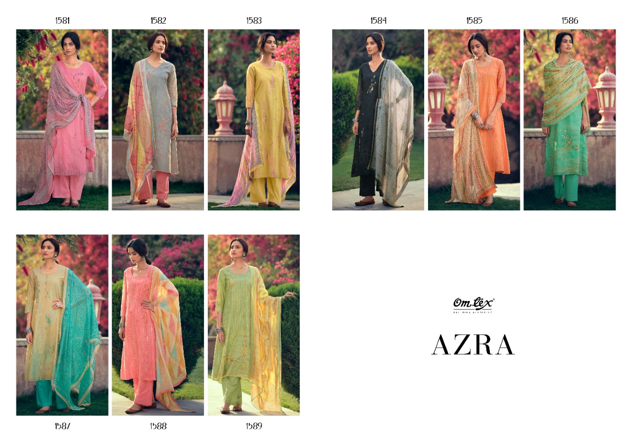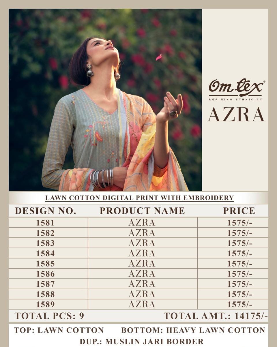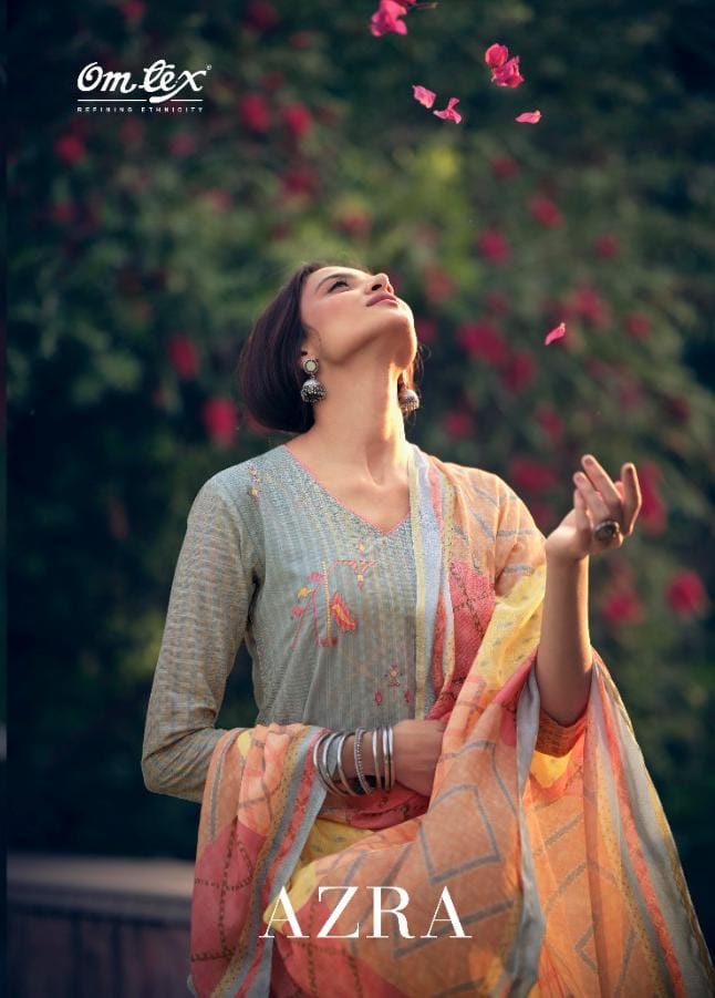 Buy Online Azra By Om Tex Dealer And Exporter Surat 9 Pcs of Full Catalogue at Wholesale Price. Looking for Azra By Om Tex Dealer And Exporter Surat Full Catalouge at Best Price? Buy Now Azra By Om Tex Dealer And Exporter Surat at Wholesale Rate of Rs 14175 with Total 9 Pcs from authroized dealer and supplier of OM TEX Brand. Cost of Each piece is just only Rs 1575 which is very low and affordable price to resale the product in your retail store ,This is Surat based Wholesale Supplier & Dealer of OM TEX Brand. Click on Brand name to Know more about OM TEX Brand's products.Call or Whatsapp on 9898838984 for booking or enquiry