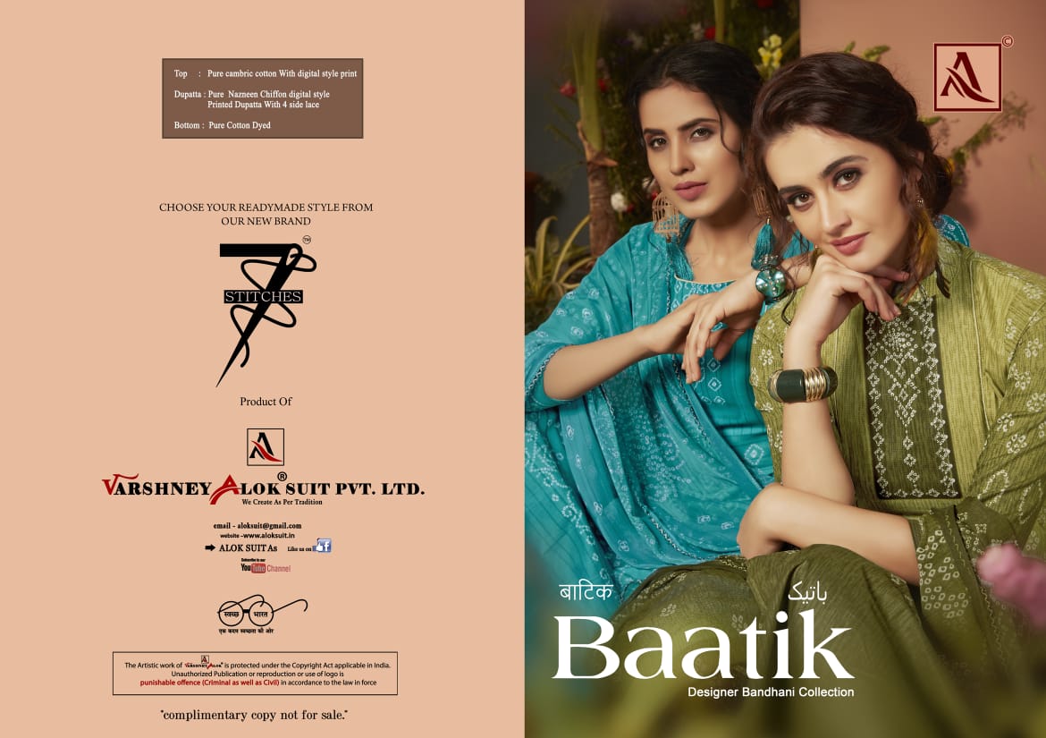 Buy Online Baatik Designer Bandhni Collection By Alok Suit 282001 Series Fancy Pure Cambric Printed Salwar Kameez Catlog Wholesaler Surat 10 Pcs of Full Catalogue at Wholesale Price. Looking for Baatik Designer Bandhni Collection By Alok Suit 282001 Series Fancy Pure Cambric Printed Salwar Kameez Catlog Wholesaler Surat Full Catalouge at Best Price? Buy Now Baatik Designer Bandhni Collection By Alok Suit 282001 Series Fancy Pure Cambric Printed Salwar Kameez Catlog Wholesaler Surat at Wholesale Rate of Rs 4390 with Total 10 Pcs from authroized dealer and supplier of Brand. Cost of Each piece is just only Rs 439 which is very low and affordable price to resale the product in your retail store ,This is Surat based Wholesale Supplier & Dealer of Brand. Click on Brand name to Know more about Brand's products.Call or Whatsapp on 9898838984 for booking or enquiry