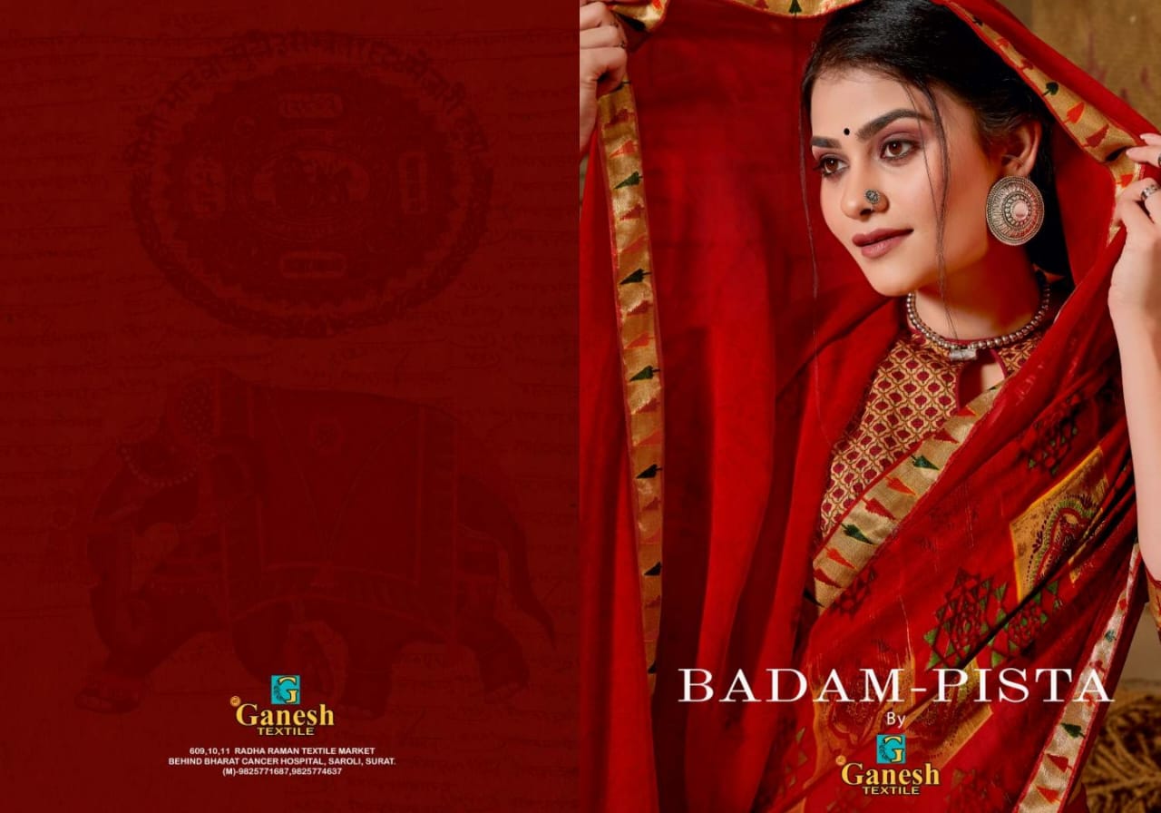Buy Online Badam Pista By Ganesh Textiles Designer Saree Wholesale Suppliers And Dealer From India 10 Pcs of Full Catalogue at Wholesale Price. Looking for Badam Pista By Ganesh Textiles Designer Saree Wholesale Suppliers And Dealer From India Full Catalouge at Best Price? Buy Now Badam Pista By Ganesh Textiles Designer Saree Wholesale Suppliers And Dealer From India at Wholesale Rate of Rs 5950 with Total 10 Pcs from authroized dealer and supplier of Brand. Cost of Each piece is just only Rs 595 which is very low and affordable price to resale the product in your retail store ,This is Surat based Wholesale Supplier & Dealer of Brand. Click on Brand name to Know more about Brand's products.Call or Whatsapp on 9898838984 for booking or enquiry