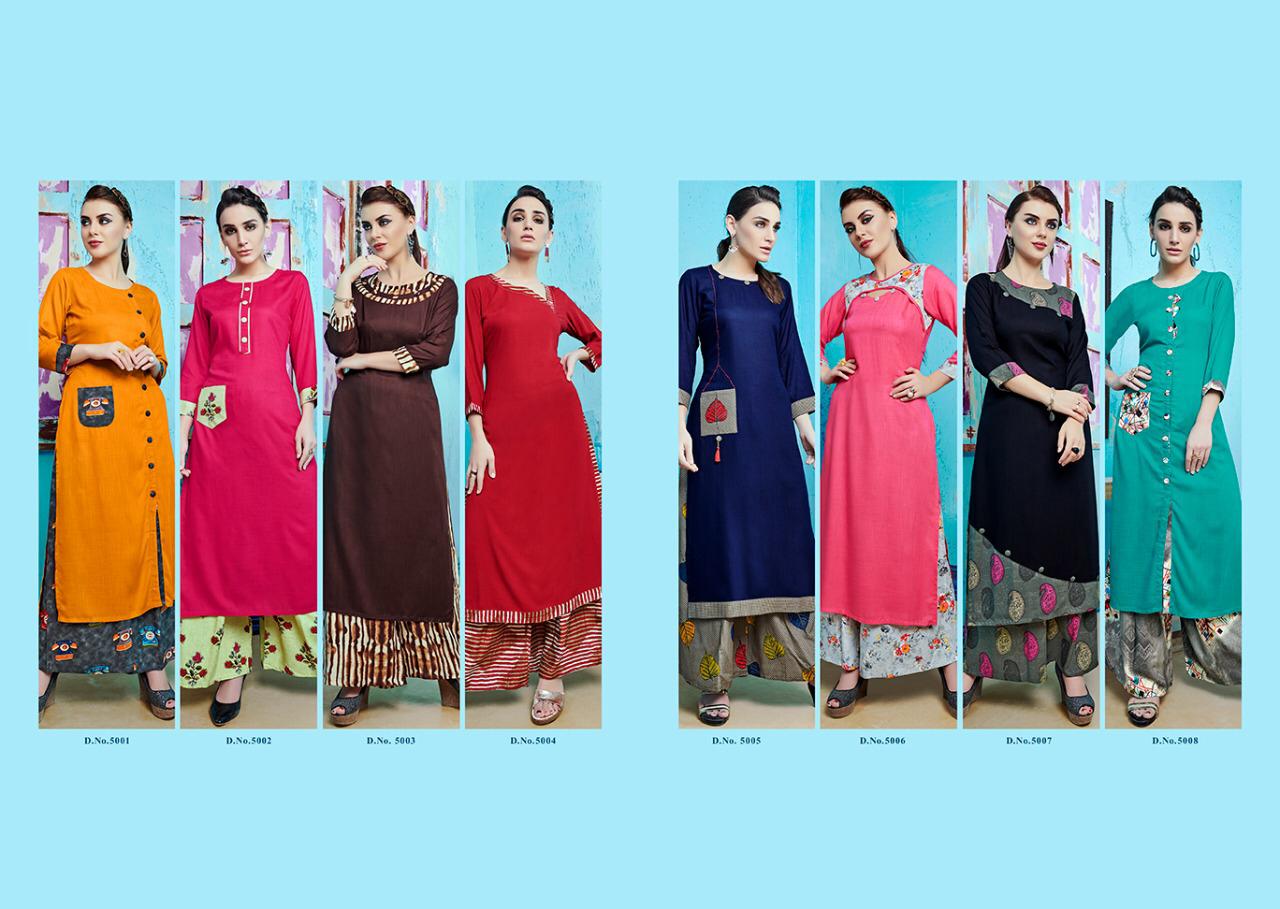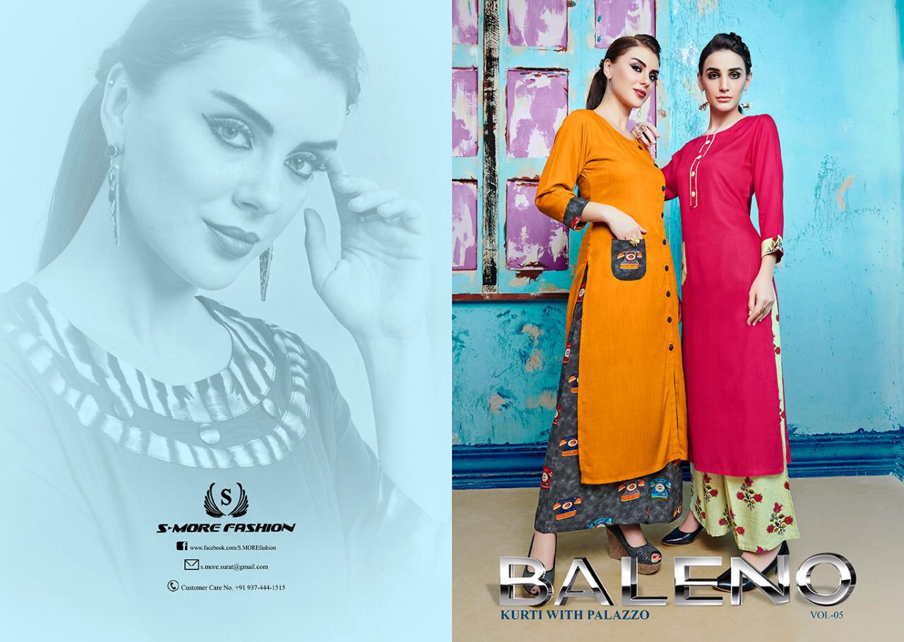 Buy Online Baleno Vol 5 By S More Fashion 5001 Series Fancy Reyon Kurti With Plazo Collection Wholesaler Surat 8 Pcs of Full Catalogue at Wholesale Price. Looking for Baleno Vol 5 By S More Fashion 5001 Series Fancy Reyon Kurti With Plazo Collection Wholesaler Surat Full Catalouge at Best Price? Buy Now Baleno Vol 5 By S More Fashion 5001 Series Fancy Reyon Kurti With Plazo Collection Wholesaler Surat at Wholesale Rate of Rs 5400 with Total 8 Pcs from authroized dealer and supplier of S MORE FASHION Brand. Cost of Each piece is just only Rs 675 which is very low and affordable price to resale the product in your retail store ,This is Surat based Wholesale Supplier & Dealer of S MORE FASHION Brand. Click on Brand name to Know more about S MORE FASHION Brand's products.Call or Whatsapp on 9898838984 for booking or enquiry