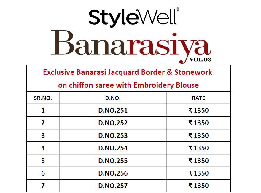 Buy Online Banarasiya Vol 3 By Style Well Wholesaler Supplier From Surat 7 Pcs of Full Catalogue at Wholesale Price. Looking for Banarasiya Vol 3 By Style Well Wholesaler Supplier From Surat Full Catalouge at Best Price? Buy Now Banarasiya Vol 3 By Style Well Wholesaler Supplier From Surat at Wholesale Rate of Rs 9450 with Total 7 Pcs from authroized dealer and supplier of STYLE WELL Brand. Cost of Each piece is just only Rs 1350 which is very low and affordable price to resale the product in your retail store ,This is Surat based Wholesale Supplier & Dealer of STYLE WELL Brand. Click on Brand name to Know more about STYLE WELL Brand's products.Call or Whatsapp on 9898838984 for booking or enquiry