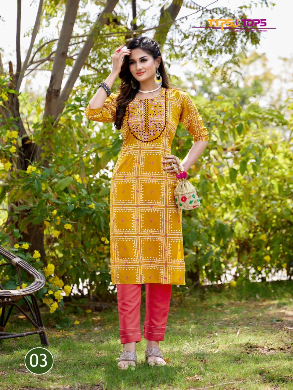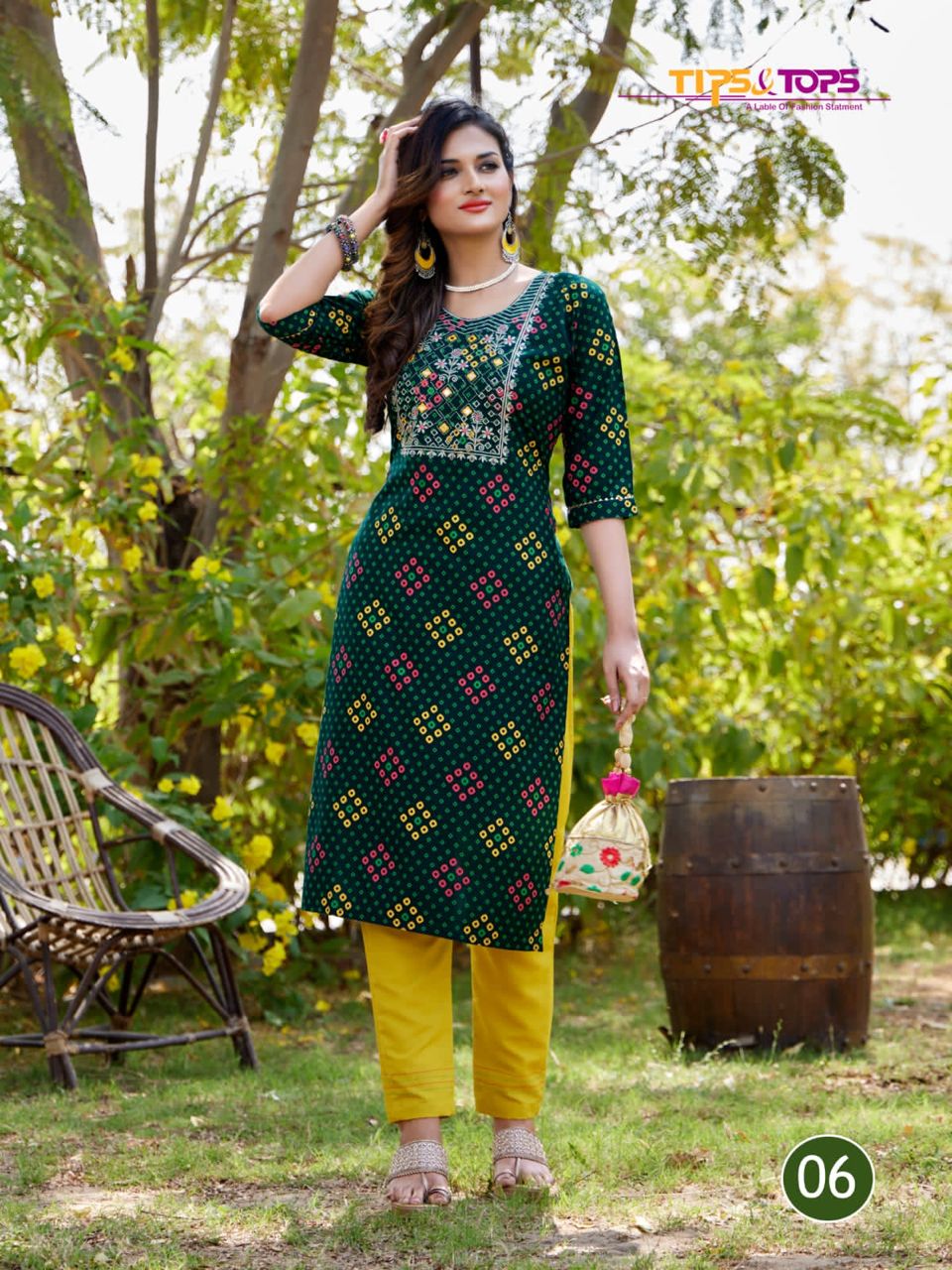 Buy Online Bandhej Vol 2 By Tips Tops Kurti With Pant Wholesaler Supplier From Surat 6 Pcs of Full Catalogue at Wholesale Price. Looking for Bandhej Vol 2 By Tips Tops Kurti With Pant Wholesaler Supplier From Surat Full Catalouge at Best Price? Buy Now Bandhej Vol 2 By Tips Tops Kurti With Pant Wholesaler Supplier From Surat at Wholesale Rate of Rs 3450 with Total 6 Pcs from authroized dealer and supplier of Brand. Cost of Each piece is just only Rs 575 which is very low and affordable price to resale the product in your retail store ,This is Surat based Wholesale Supplier & Dealer of Brand. Click on Brand name to Know more about Brand's products.Call or Whatsapp on 9898838984 for booking or enquiry