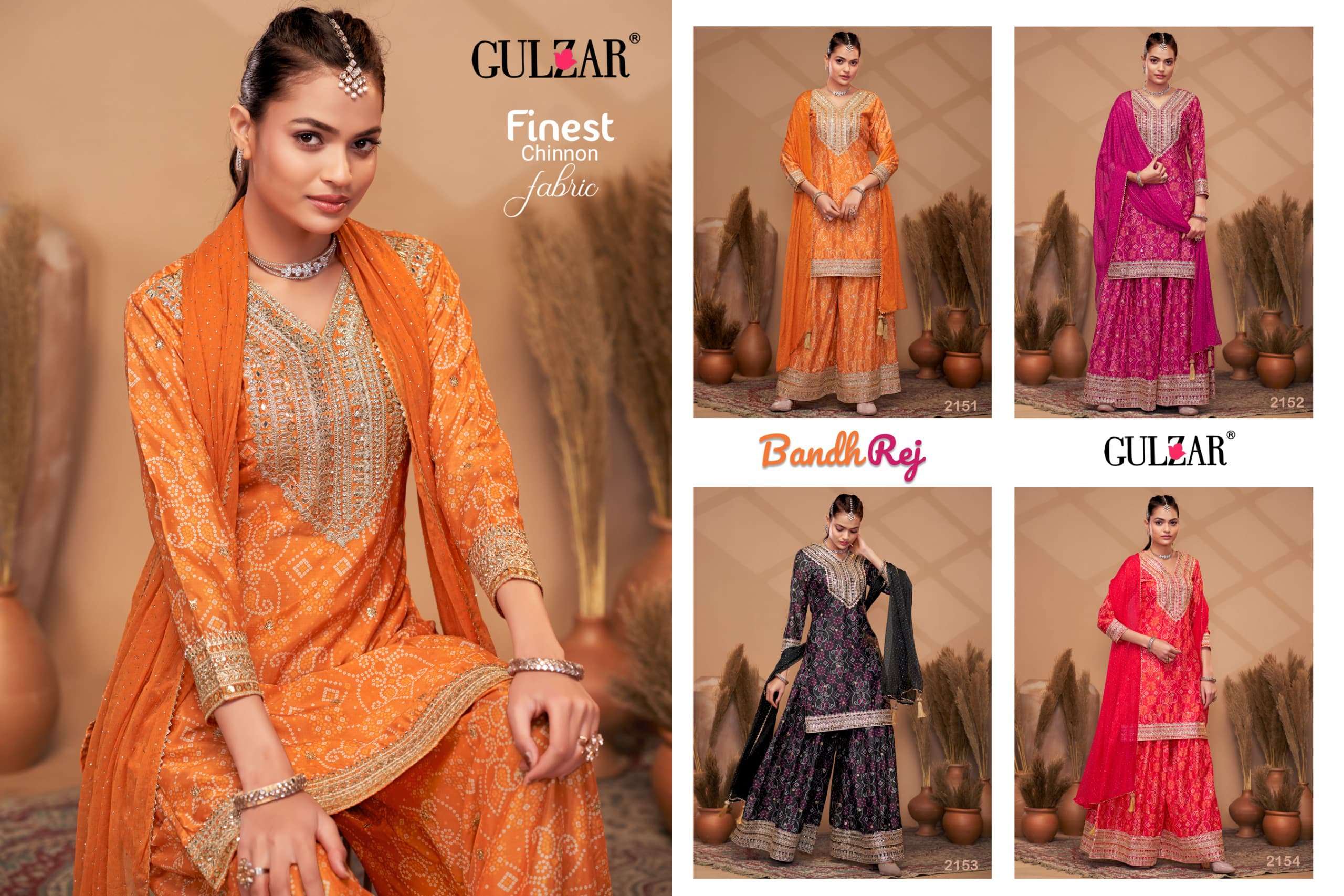 Buy Online BandhRej by Gulzar suit collection manufacturer surat 4 Pcs of Full Catalogue at Wholesale Price. Looking for BandhRej by Gulzar suit collection manufacturer surat Full Catalouge at Best Price? Buy Now BandhRej by Gulzar suit collection manufacturer surat at Wholesale Rate of Rs 9600 with Total 4 Pcs from authroized dealer and supplier of GULZAR Brand. Cost of Each piece is just only Rs 2400 which is very low and affordable price to resale the product in your retail store ,This is Surat based Wholesale Supplier & Dealer of GULZAR Brand. Click on Brand name to Know more about GULZAR Brand's products.Call or Whatsapp on 9898838984 for booking or enquiry