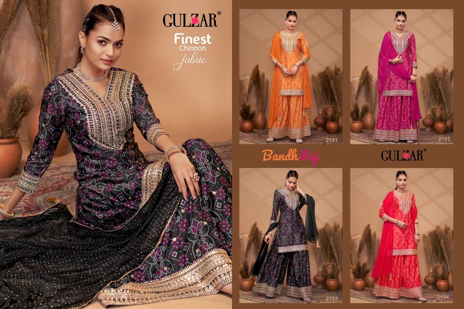 Buy Online BANDHREJ D NO 2151 TO 2154 by GULZAR suit collection manufacturers surat 4 Pcs of Full Catalogue at Wholesale Price. Looking for BANDHREJ D NO 2151 TO 2154 by GULZAR suit collection manufacturers surat Full Catalouge at Best Price? Buy Now BANDHREJ D NO 2151 TO 2154 by GULZAR suit collection manufacturers surat at Wholesale Rate of Rs 9580 with Total 4 Pcs from authroized dealer and supplier of BRAND'S Brand. Cost of Each piece is just only Rs 2395 which is very low and affordable price to resale the product in your retail store ,This is Surat based Wholesale Supplier & Dealer of BRAND'S Brand. Click on Brand name to Know more about BRAND'S Brand's products.Call or Whatsapp on 9898838984 for booking or enquiry