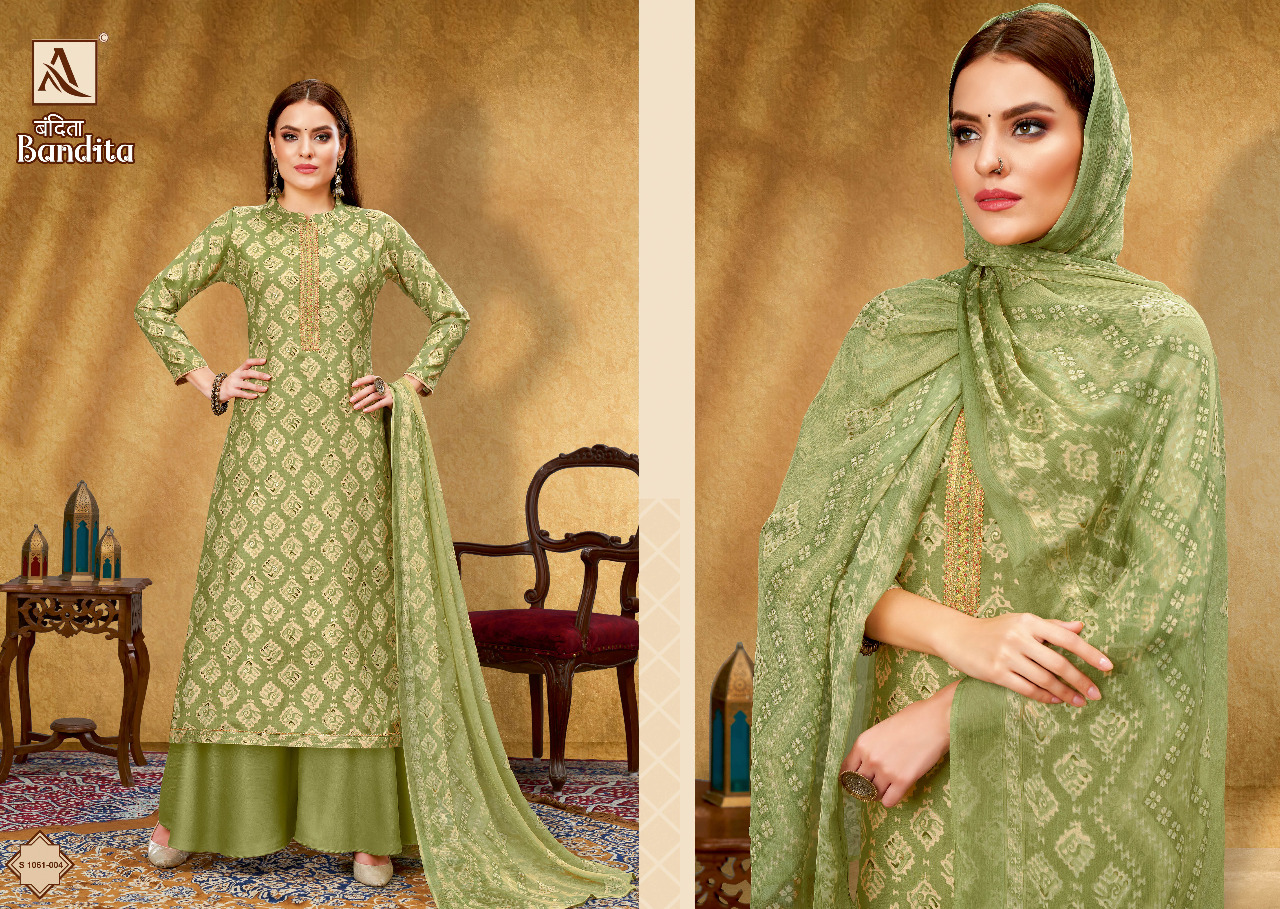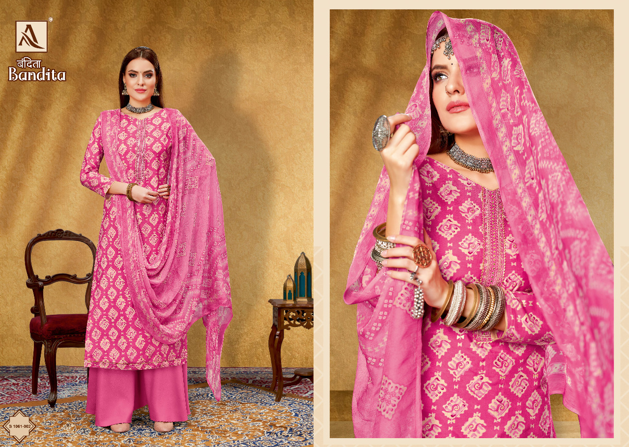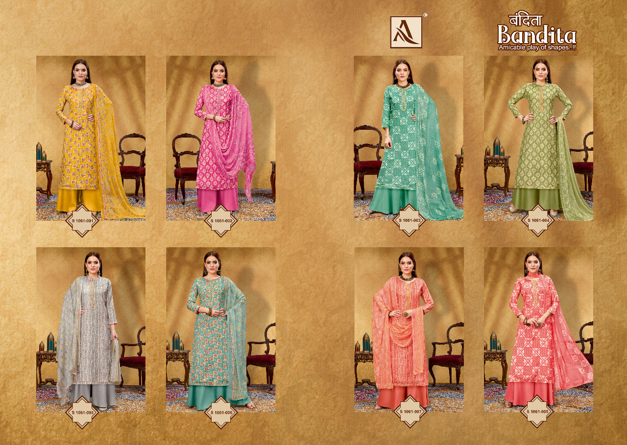 Buy Online Bandita By Alok Suit 8 Pcs of Full Catalogue at Wholesale Price. Looking for Bandita By Alok Suit Full Catalouge at Best Price? Buy Now Bandita By Alok Suit at Wholesale Rate of Rs 6392 with Total 8 Pcs from authroized dealer and supplier of Brand. Cost of Each piece is just only Rs 799 which is very low and affordable price to resale the product in your retail store ,This is Surat based Wholesale Supplier & Dealer of Brand. Click on Brand name to Know more about Brand's products.Call or Whatsapp on 9898838984 for booking or enquiry
