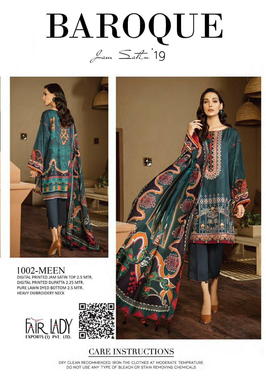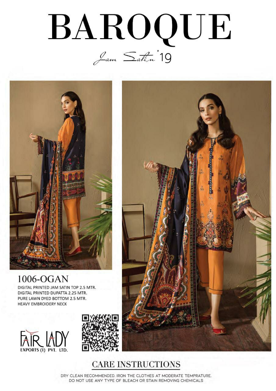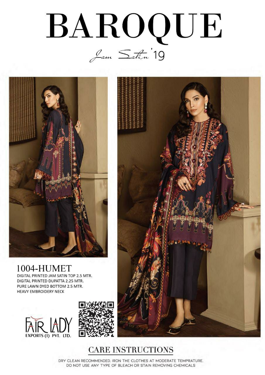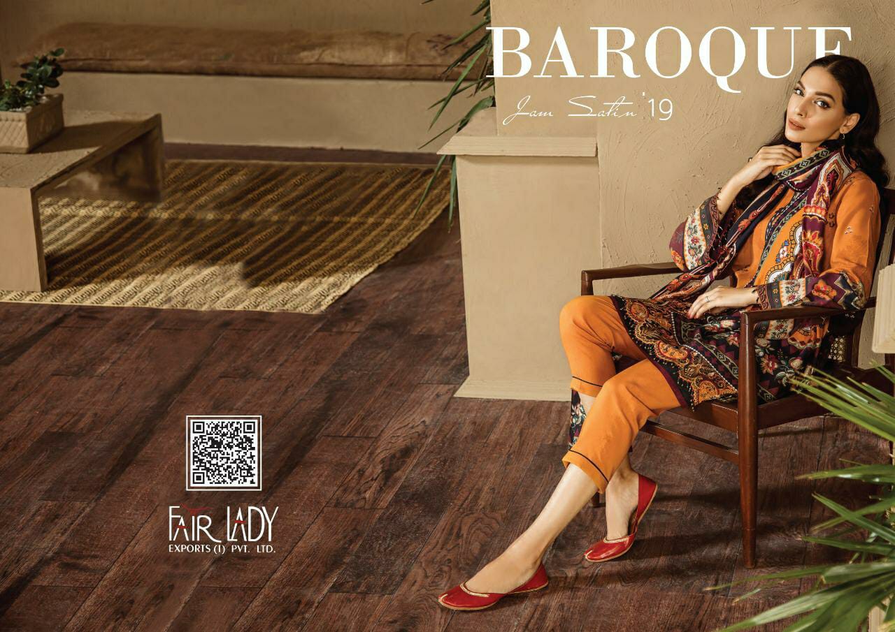 Buy Online Baroque Jam Satim By Fairlady Jam Satin Dress Materials Wholesale Supplier Surat 6 Pcs of Full Catalogue at Wholesale Price. Looking for Baroque Jam Satim By Fairlady Jam Satin Dress Materials Wholesale Supplier Surat Full Catalouge at Best Price? Buy Now Baroque Jam Satim By Fairlady Jam Satin Dress Materials Wholesale Supplier Surat at Wholesale Rate of Rs 4494 with Total 6 Pcs from authroized dealer and supplier of Brand. Cost of Each piece is just only Rs 749 which is very low and affordable price to resale the product in your retail store ,This is Surat based Wholesale Supplier & Dealer of Brand. Click on Brand name to Know more about Brand's products.Call or Whatsapp on 9898838984 for booking or enquiry