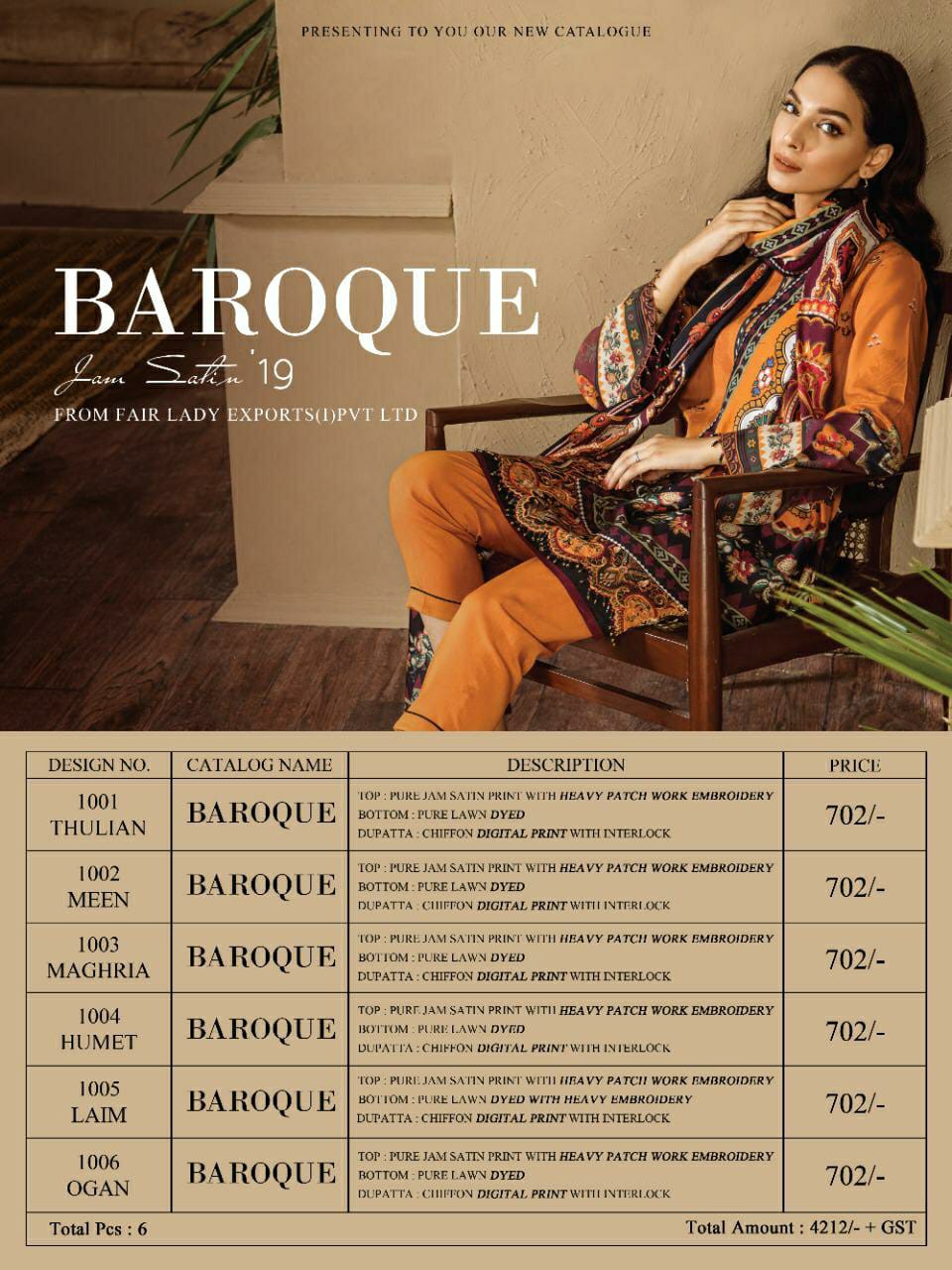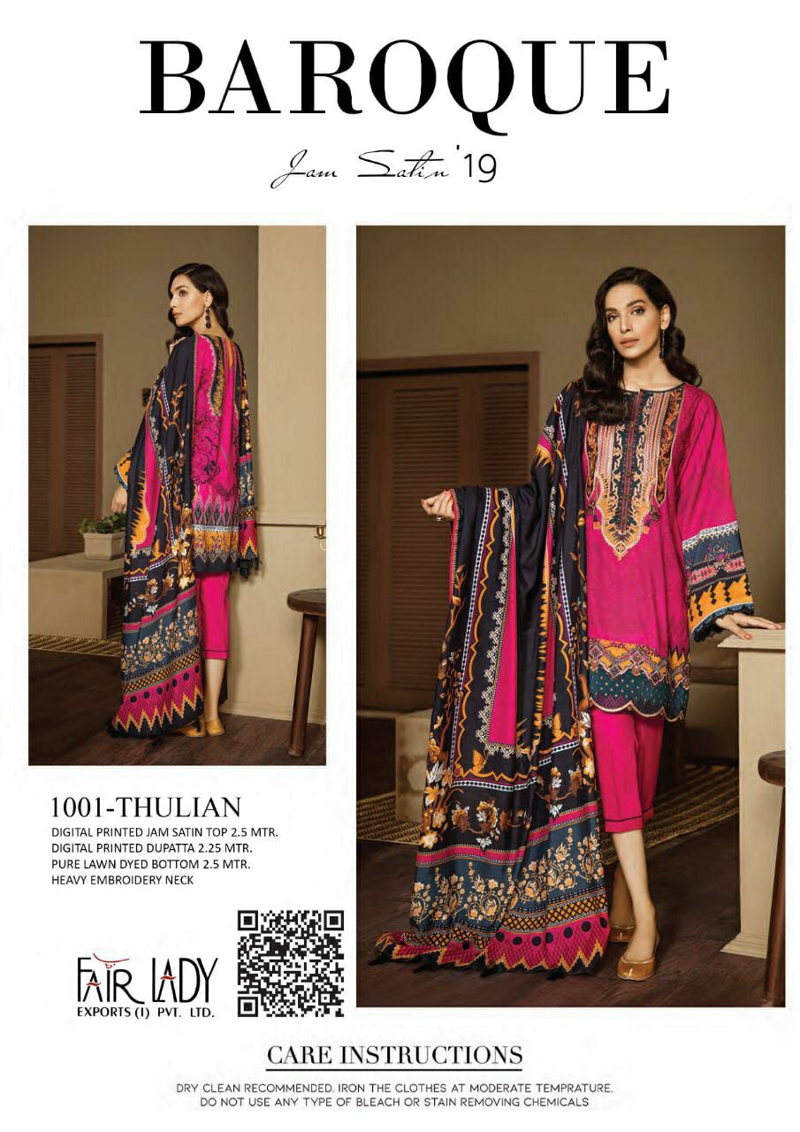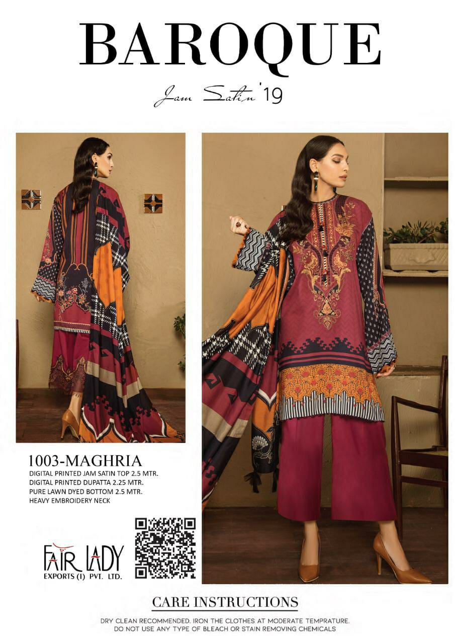 Buy Online Baroque Jam Satim By Fairlady Jam Satin Dress Materials Wholesale Supplier Surat 6 Pcs of Full Catalogue at Wholesale Price. Looking for Baroque Jam Satim By Fairlady Jam Satin Dress Materials Wholesale Supplier Surat Full Catalouge at Best Price? Buy Now Baroque Jam Satim By Fairlady Jam Satin Dress Materials Wholesale Supplier Surat at Wholesale Rate of Rs 4494 with Total 6 Pcs from authroized dealer and supplier of Brand. Cost of Each piece is just only Rs 749 which is very low and affordable price to resale the product in your retail store ,This is Surat based Wholesale Supplier & Dealer of Brand. Click on Brand name to Know more about Brand's products.Call or Whatsapp on 9898838984 for booking or enquiry