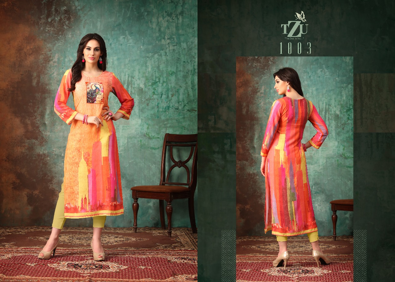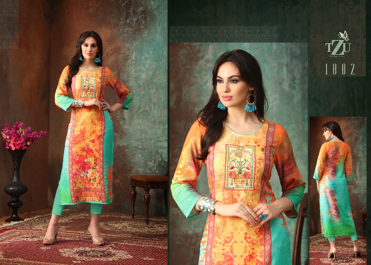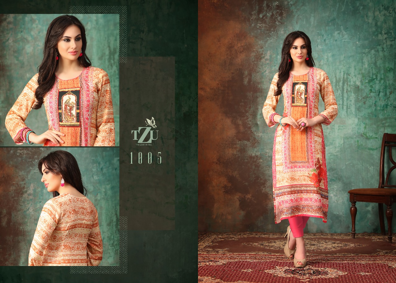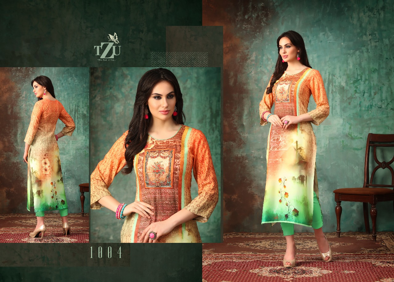 Buy Online Beautiful By Tzu 1001 Series Fancy Reyon Digital Printed Kurti Catlog Wholesale Dealer Surat 5 Pcs of Full Catalogue at Wholesale Price. Looking for Beautiful By Tzu 1001 Series Fancy Reyon Digital Printed Kurti Catlog Wholesale Dealer Surat Full Catalouge at Best Price? Buy Now Beautiful By Tzu 1001 Series Fancy Reyon Digital Printed Kurti Catlog Wholesale Dealer Surat at Wholesale Rate of Rs 3475 with Total 5 Pcs from authroized dealer and supplier of Brand. Cost of Each piece is just only Rs 695 which is very low and affordable price to resale the product in your retail store ,This is Surat based Wholesale Supplier & Dealer of Brand. Click on Brand name to Know more about Brand's products.Call or Whatsapp on 9898838984 for booking or enquiry
