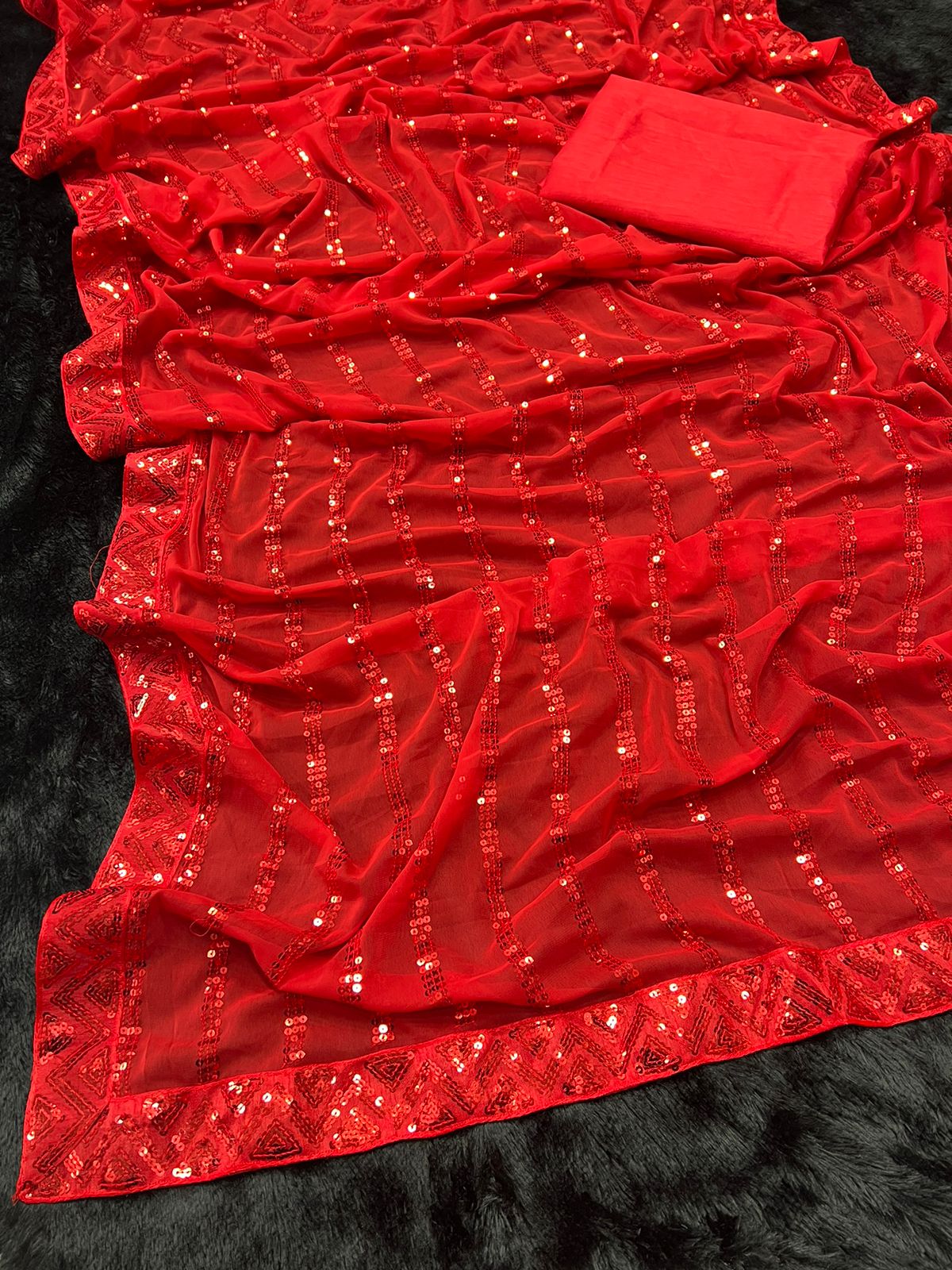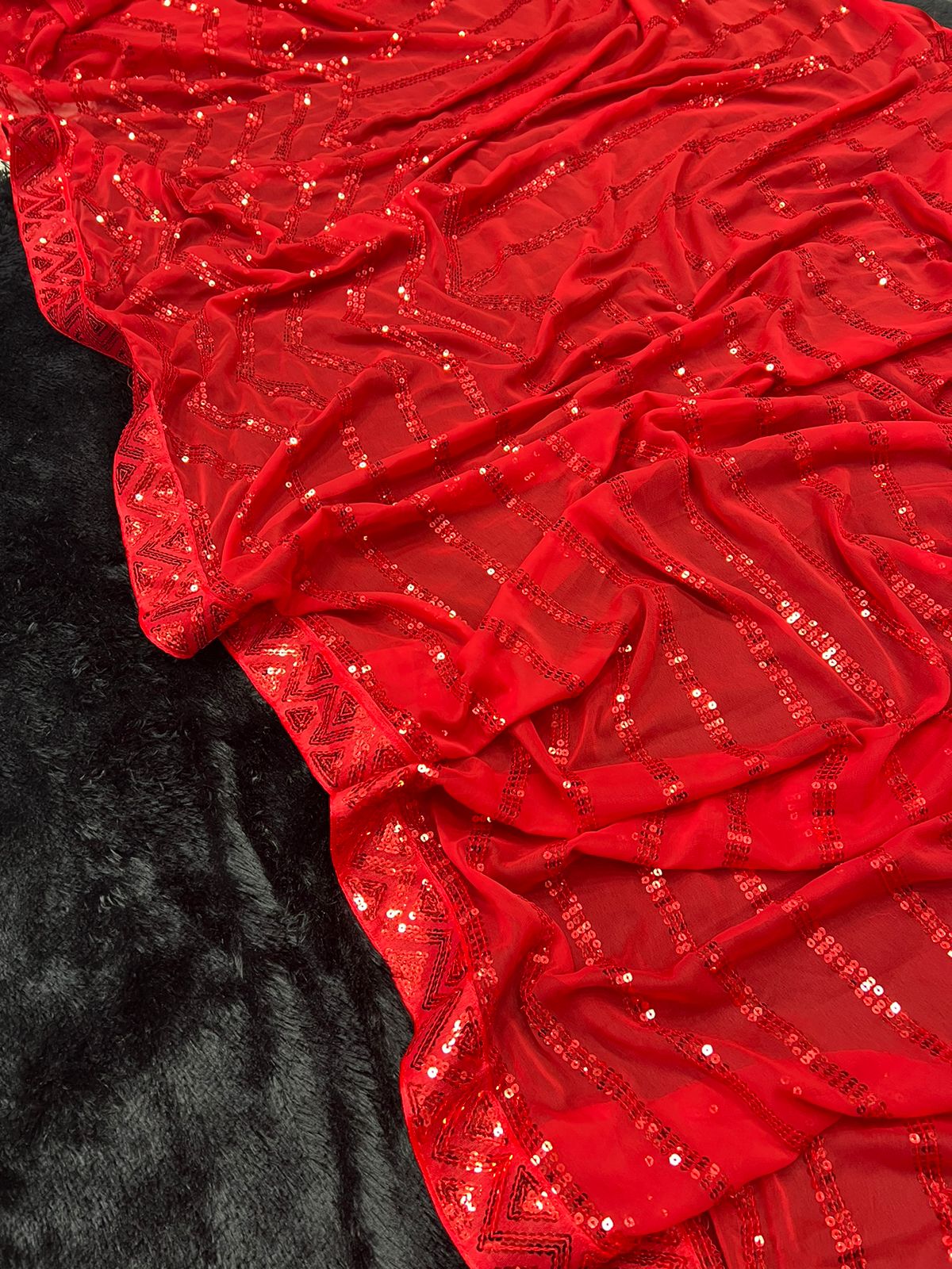 Beautiful Full Red Colour Sequence Work Saree With Blouse