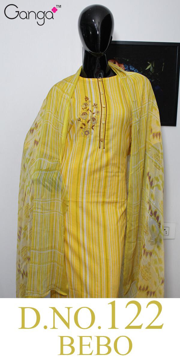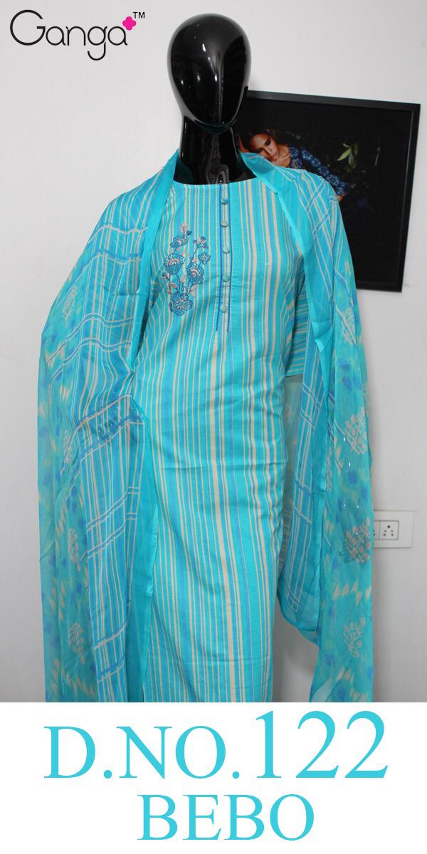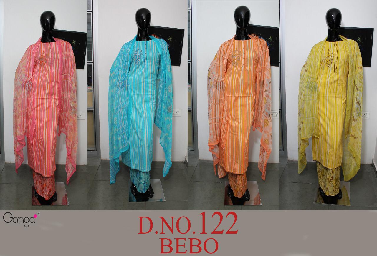Buy Online Bebo 122 By Ganga Cotton Embroidered Suits Wholesale Supplier Gujarat 4 Pcs of Full Catalogue at Wholesale Price. Looking for Bebo 122 By Ganga Cotton Embroidered Suits Wholesale Supplier Gujarat Full Catalouge at Best Price? Buy Now Bebo 122 By Ganga Cotton Embroidered Suits Wholesale Supplier Gujarat at Wholesale Rate of Rs 4940 with Total 4 Pcs from authroized dealer and supplier of GANGA Brand. Cost of Each piece is just only Rs 1235 which is very low and affordable price to resale the product in your retail store ,This is Surat based Wholesale Supplier & Dealer of GANGA Brand. Click on Brand name to Know more about GANGA Brand's products.Call or Whatsapp on 9898838984 for booking or enquiry