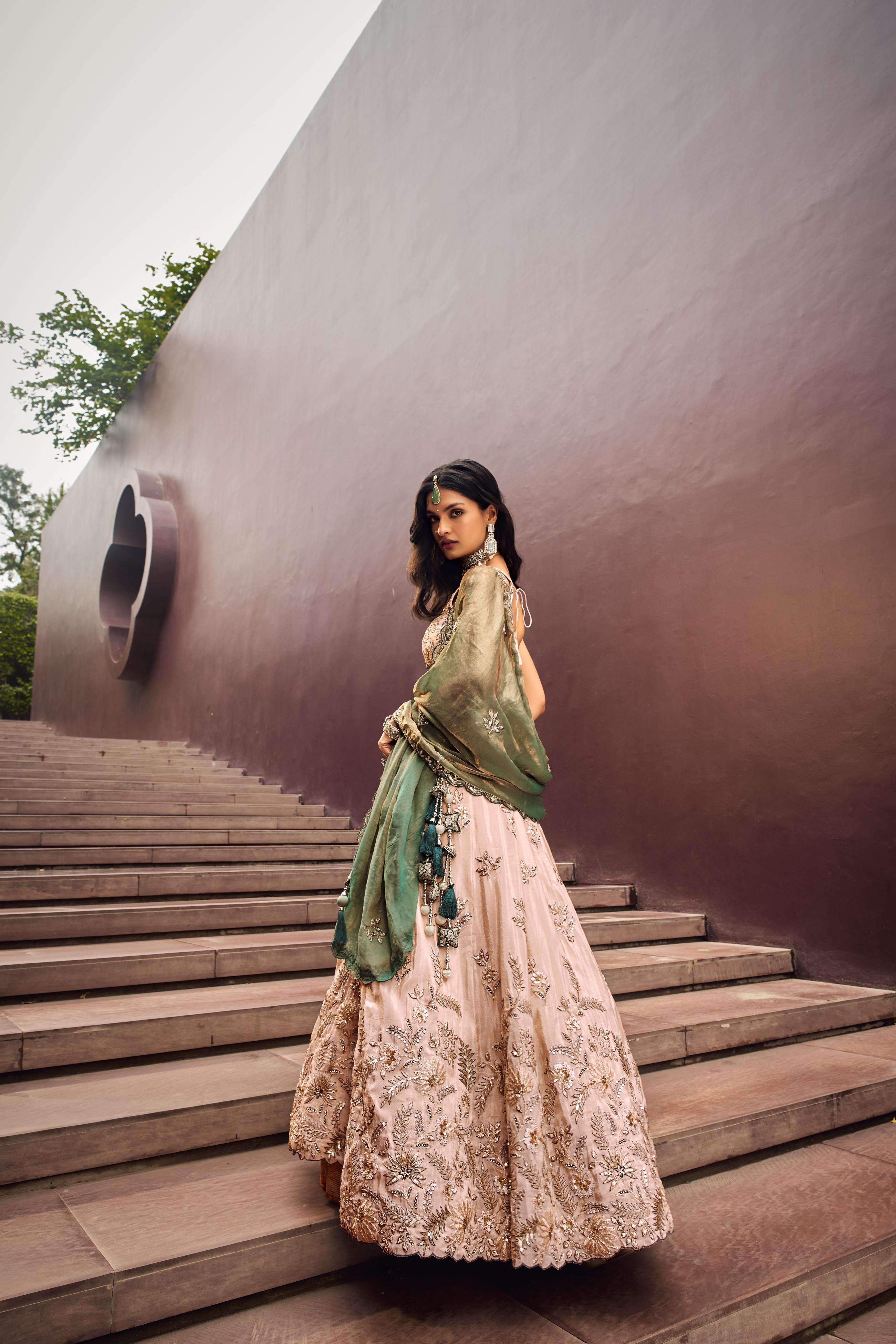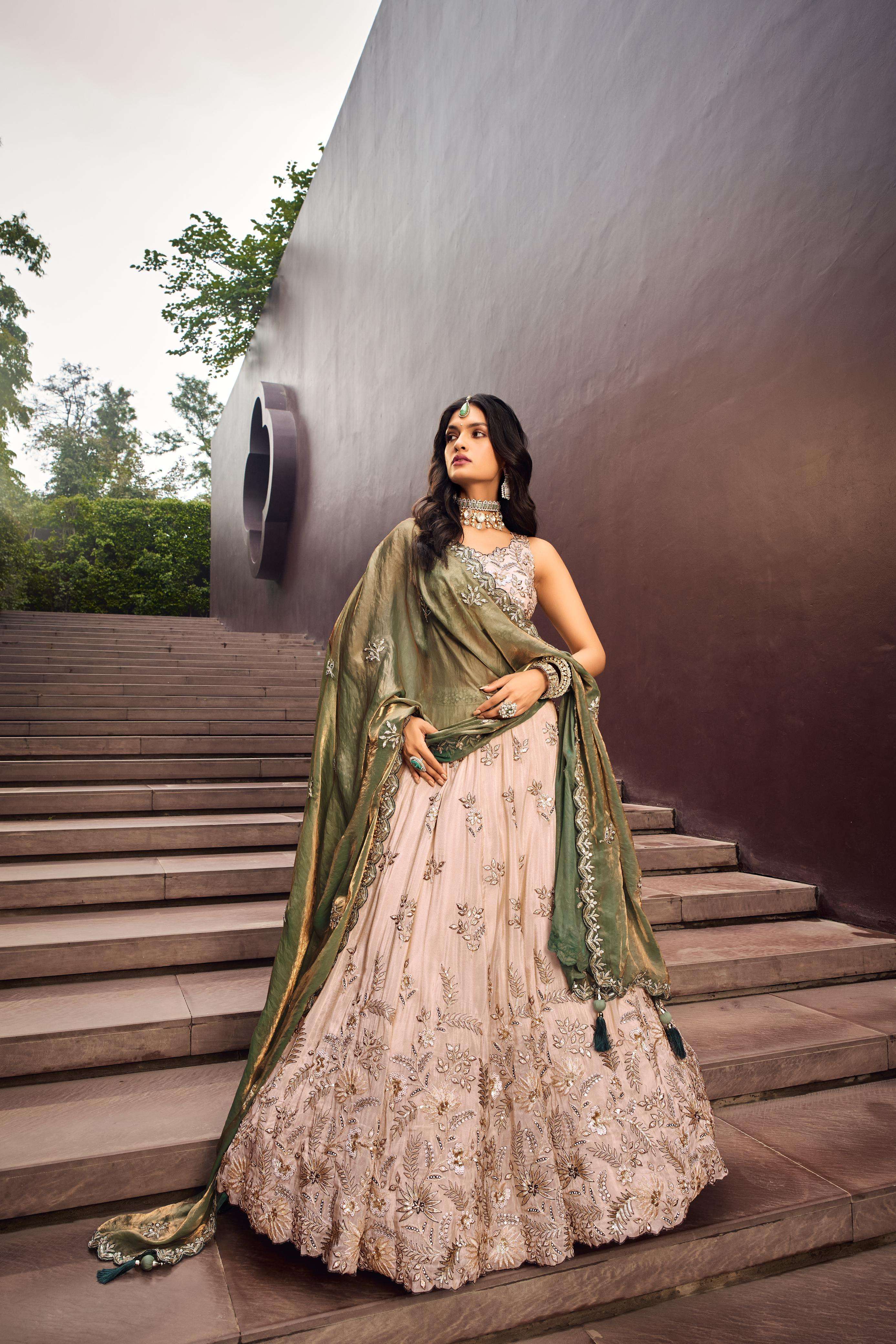 Beige Green - Beige Color Golden Sequined Using Thread,Coding & Zarkans Embroidered Viscos Semi-Stitched Lehenga choli with Contrast Dupatta