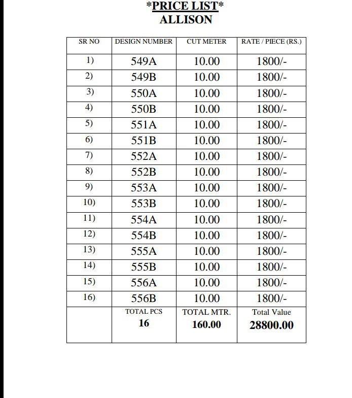 Buy Online Bela Allison Series 549 A B To 556 A B Designer Party Wear Suits Wholesale Supplier Gujarat 16 Pcs of Full Catalogue at Wholesale Price. Looking for Bela Allison Series 549 A B To 556 A B Designer Party Wear Suits Wholesale Supplier Gujarat Full Catalouge at Best Price? Buy Now Bela Allison Series 549 A B To 556 A B Designer Party Wear Suits Wholesale Supplier Gujarat at Wholesale Rate of Rs 28800 with Total 16 Pcs from authroized dealer and supplier of BELA Brand. Cost of Each piece is just only Rs 1800 which is very low and affordable price to resale the product in your retail store ,This is Surat based Wholesale Supplier & Dealer of BELA Brand. Click on Brand name to Know more about BELA Brand's products.Call or Whatsapp on 9898838984 for booking or enquiry