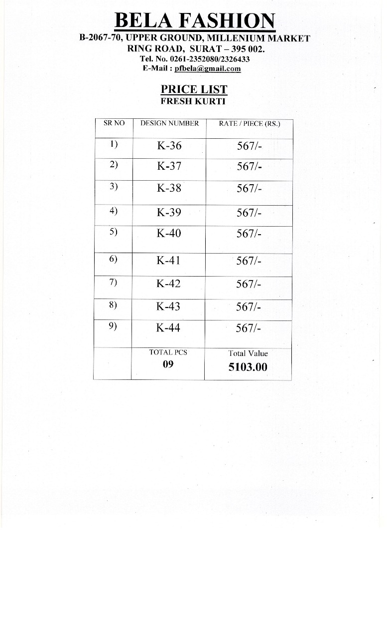 Buy Online Bela Fashion Fresh Kurti Series K 36 To K 44 Wholesale Supplier 9 Pcs of Full Catalogue at Wholesale Price. Looking for Bela Fashion Fresh Kurti Series K 36 To K 44 Wholesale Supplier Full Catalouge at Best Price? Buy Now Bela Fashion Fresh Kurti Series K 36 To K 44 Wholesale Supplier at Wholesale Rate of Rs 5103 with Total 9 Pcs from authroized dealer and supplier of BELA Brand. Cost of Each piece is just only Rs 567 which is very low and affordable price to resale the product in your retail store ,This is Surat based Wholesale Supplier & Dealer of BELA Brand. Click on Brand name to Know more about BELA Brand's products.Call or Whatsapp on 9898838984 for booking or enquiry