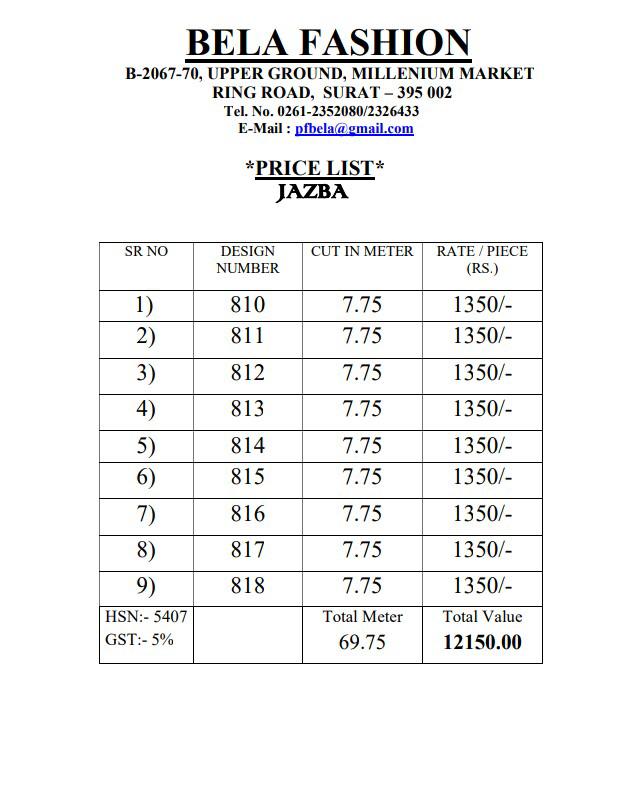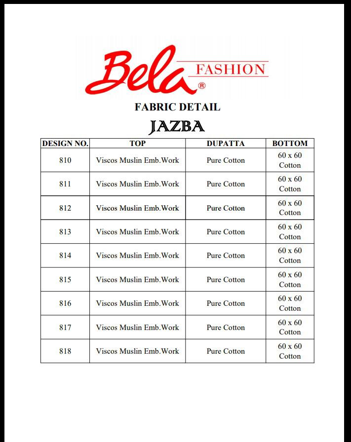 Buy Online Bela Jazba Series 810 To 818 Musline Embroidered Designer Party Wear Suits Wholesale Supplier Surat 9 Pcs of Full Catalogue at Wholesale Price. Looking for Bela Jazba Series 810 To 818 Musline Embroidered Designer Party Wear Suits Wholesale Supplier Surat Full Catalouge at Best Price? Buy Now Bela Jazba Series 810 To 818 Musline Embroidered Designer Party Wear Suits Wholesale Supplier Surat at Wholesale Rate of Rs 12150 with Total 9 Pcs from authroized dealer and supplier of BELA Brand. Cost of Each piece is just only Rs 1350 which is very low and affordable price to resale the product in your retail store ,This is Surat based Wholesale Supplier & Dealer of BELA Brand. Click on Brand name to Know more about BELA Brand's products.Call or Whatsapp on 9898838984 for booking or enquiry