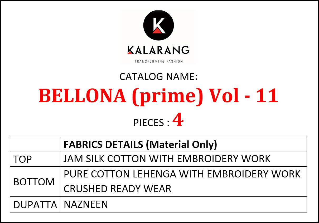 Buy Online Bellona Vol 11 By Kalarang Jm Silk Cotton Dress Materials Wholesale Supplier And Dealer Gujarat 4 Pcs of Full Catalogue at Wholesale Price. Looking for Bellona Vol 11 By Kalarang Jm Silk Cotton Dress Materials Wholesale Supplier And Dealer Gujarat Full Catalouge at Best Price? Buy Now Bellona Vol 11 By Kalarang Jm Silk Cotton Dress Materials Wholesale Supplier And Dealer Gujarat at Wholesale Rate of Rs 3596 with Total 4 Pcs from authroized dealer and supplier of KALARANG Brand. Cost of Each piece is just only Rs 899 which is very low and affordable price to resale the product in your retail store ,This is Surat based Wholesale Supplier & Dealer of KALARANG Brand. Click on Brand name to Know more about KALARANG Brand's products.Call or Whatsapp on 9898838984 for booking or enquiry