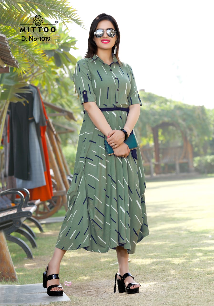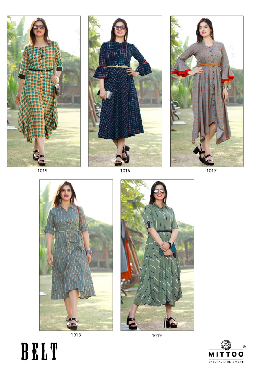 Belt By Mittoo Reyon Printed Kurtis Collection Wholesale Supplier Gujarat