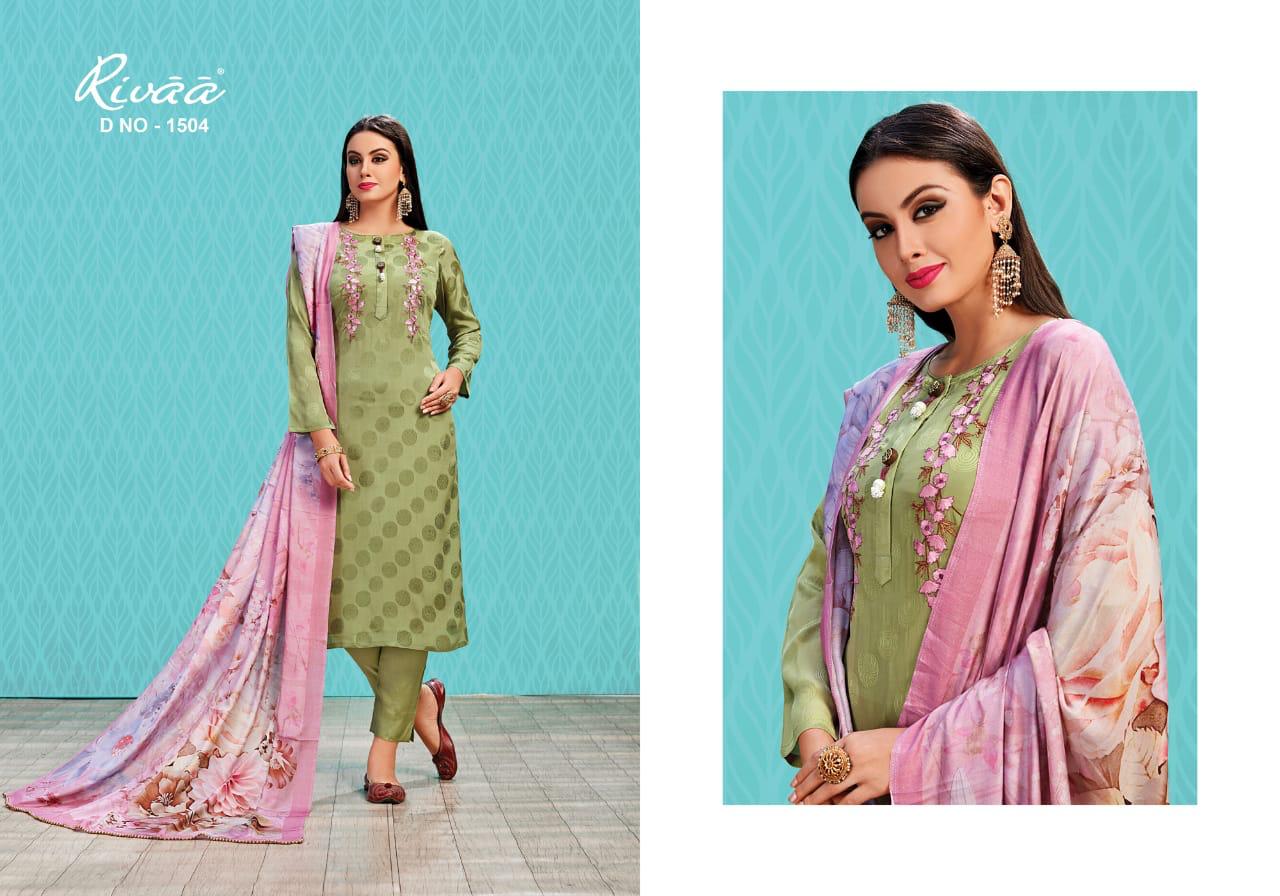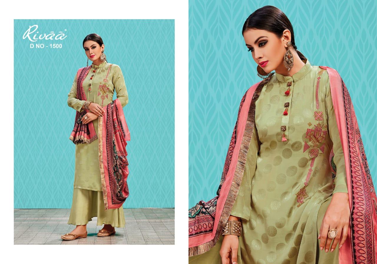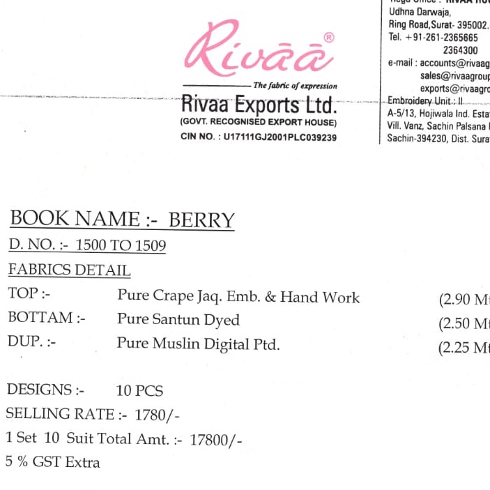 Buy Online Berry By Rivaa Export 1500 Series Pure Crepe Jeqard Salwar Kameez Catlog Wholesale Dealer And Supplier Surat 10 Pcs of Full Catalogue at Wholesale Price. Looking for Berry By Rivaa Export 1500 Series Pure Crepe Jeqard Salwar Kameez Catlog Wholesale Dealer And Supplier Surat Full Catalouge at Best Price? Buy Now Berry By Rivaa Export 1500 Series Pure Crepe Jeqard Salwar Kameez Catlog Wholesale Dealer And Supplier Surat at Wholesale Rate of Rs 17800 with Total 10 Pcs from authroized dealer and supplier of RIVAA Brand. Cost of Each piece is just only Rs 1780 which is very low and affordable price to resale the product in your retail store ,This is Surat based Wholesale Supplier & Dealer of RIVAA Brand. Click on Brand name to Know more about RIVAA Brand's products.Call or Whatsapp on 9898838984 for booking or enquiry