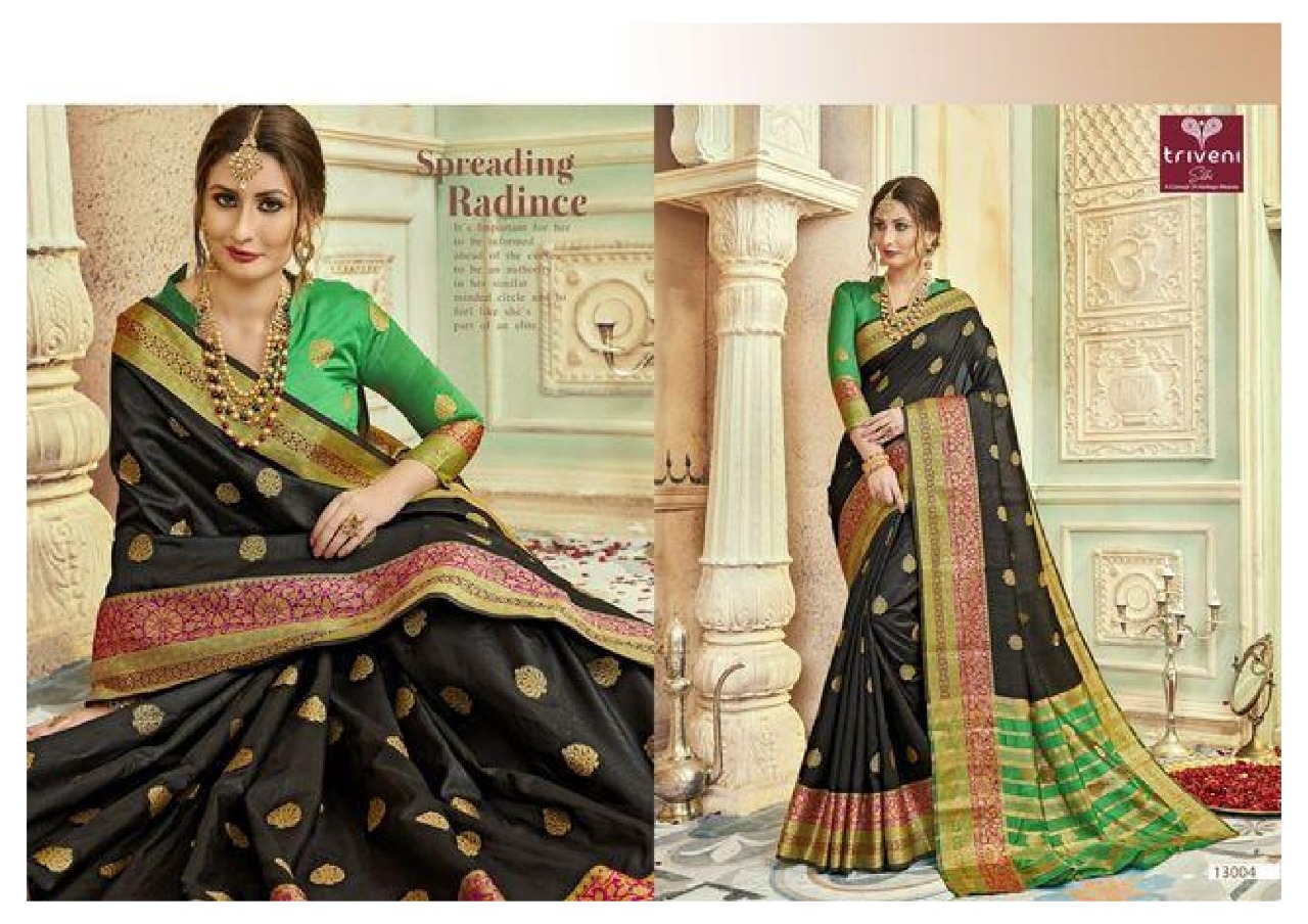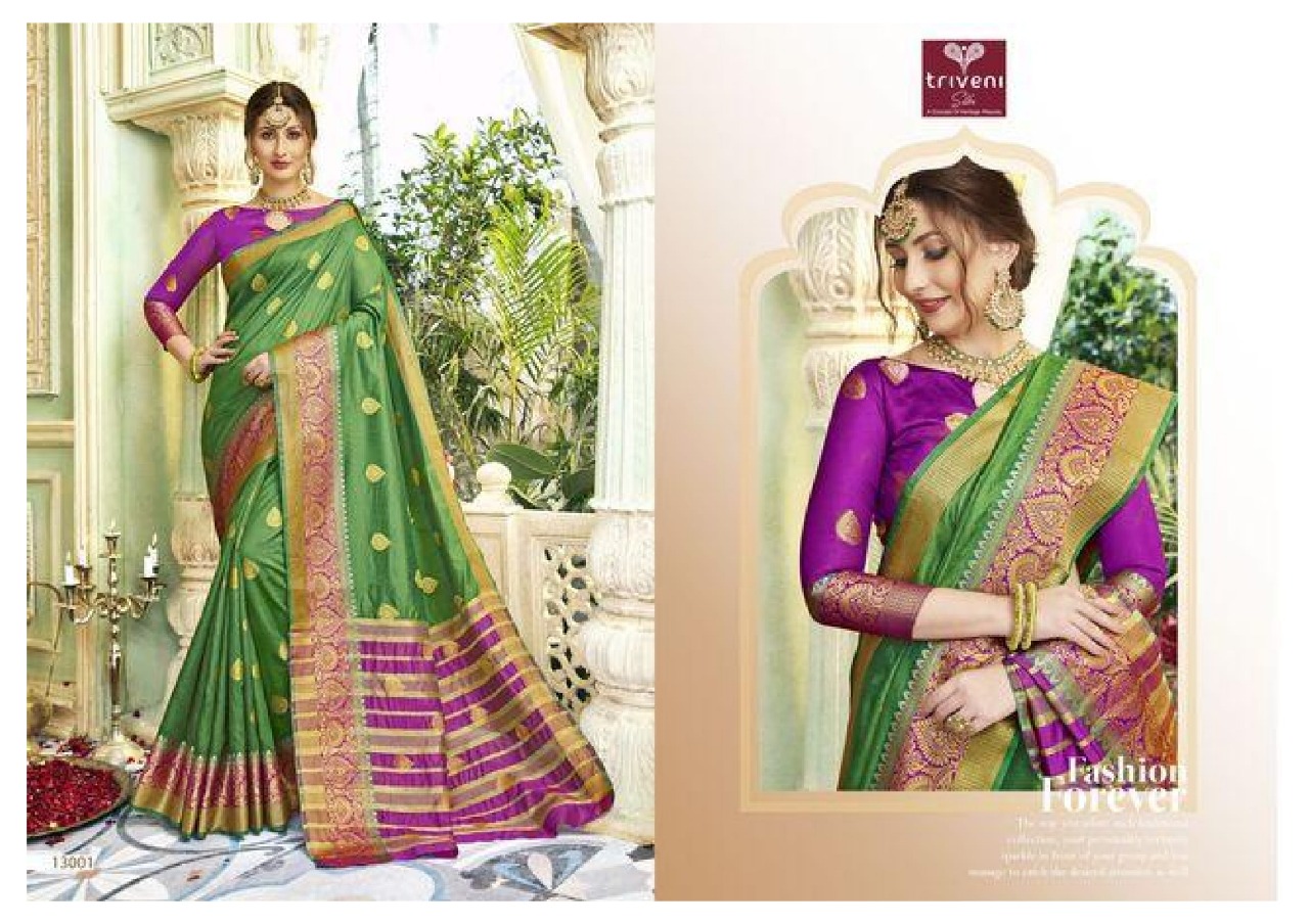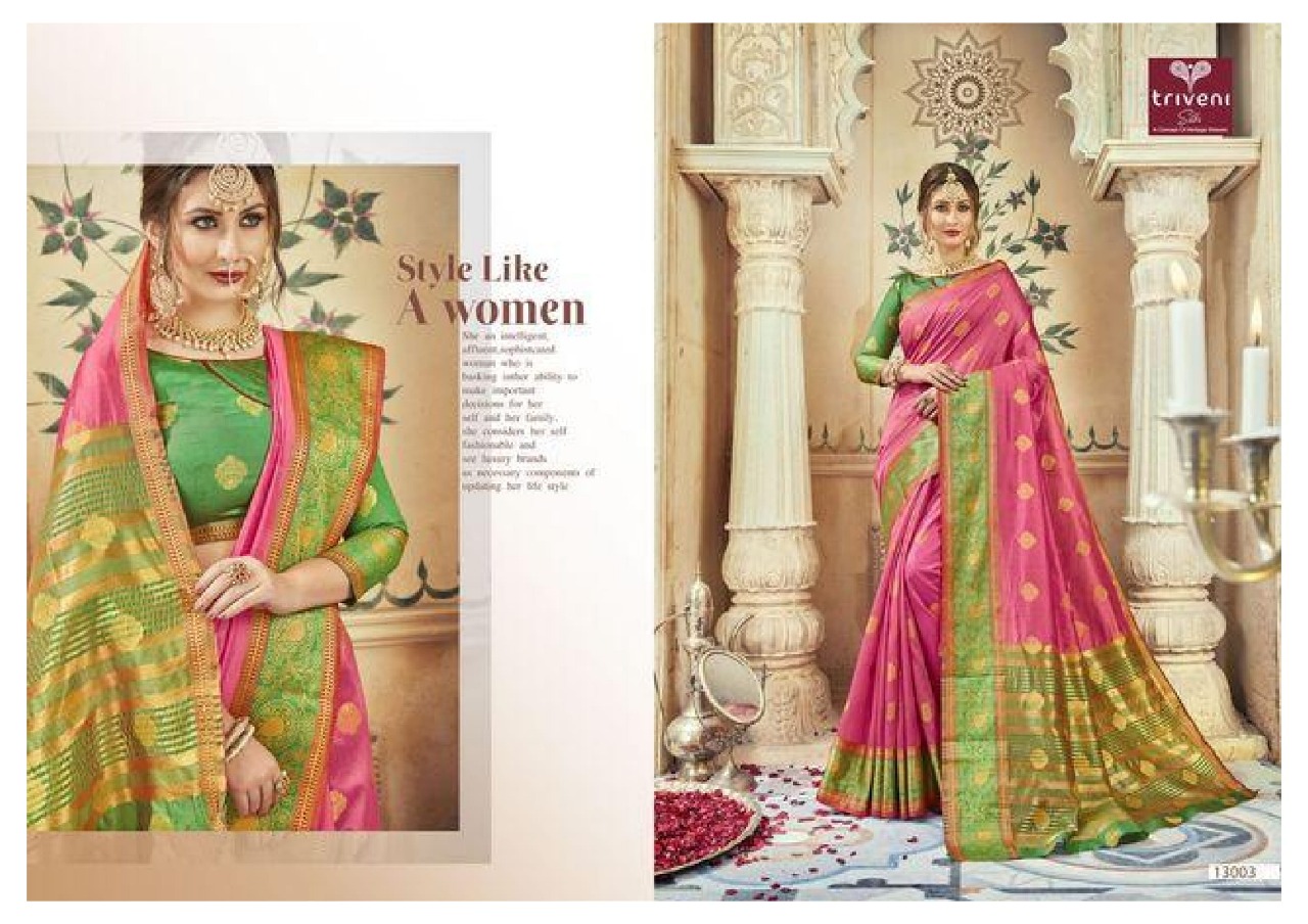 Brand - Triveni. Catlog name - Bhargavi. Rate - 726 per Pcs . Weaving silk Fabric. Set To set GST 5 Percent Extra Delivery- 2-3 DIN |