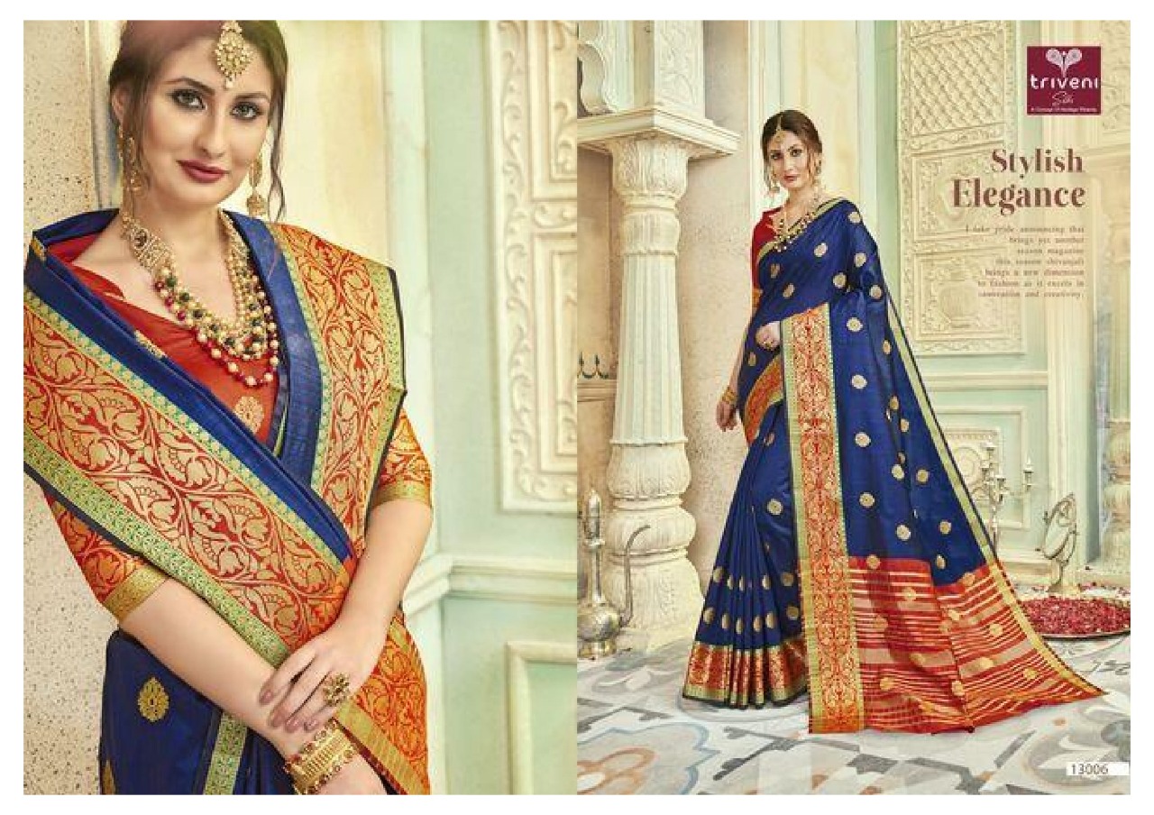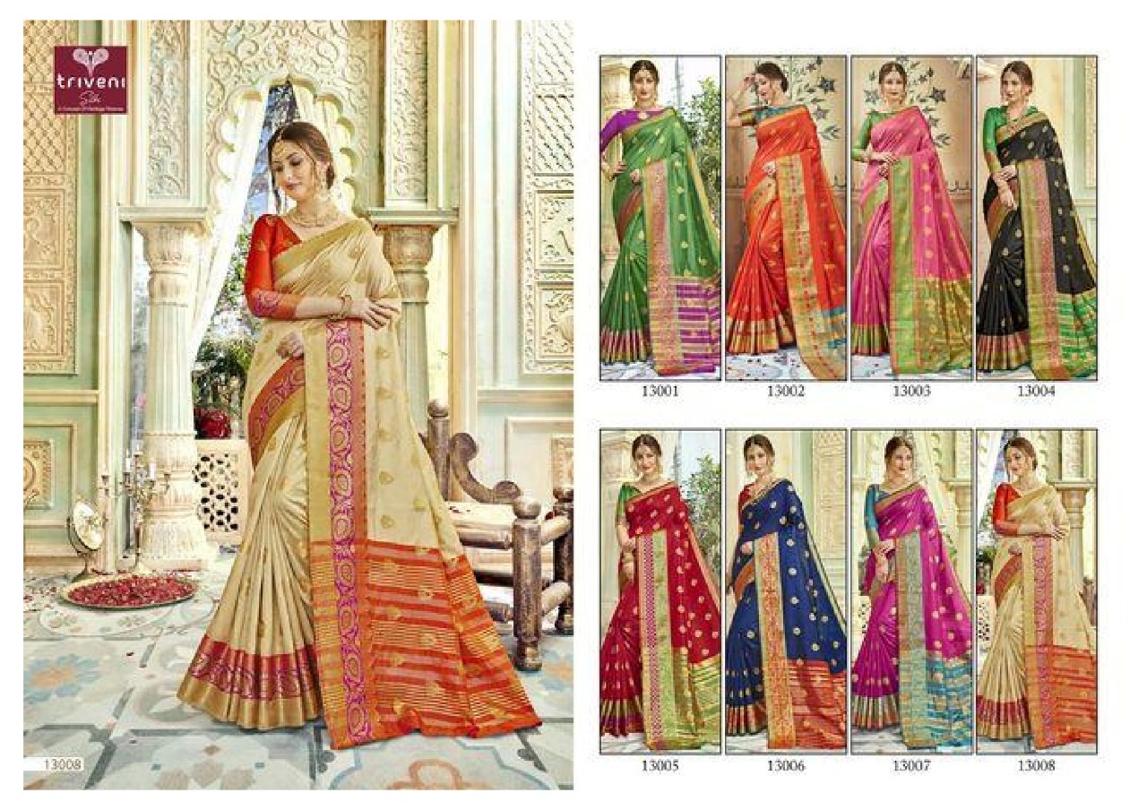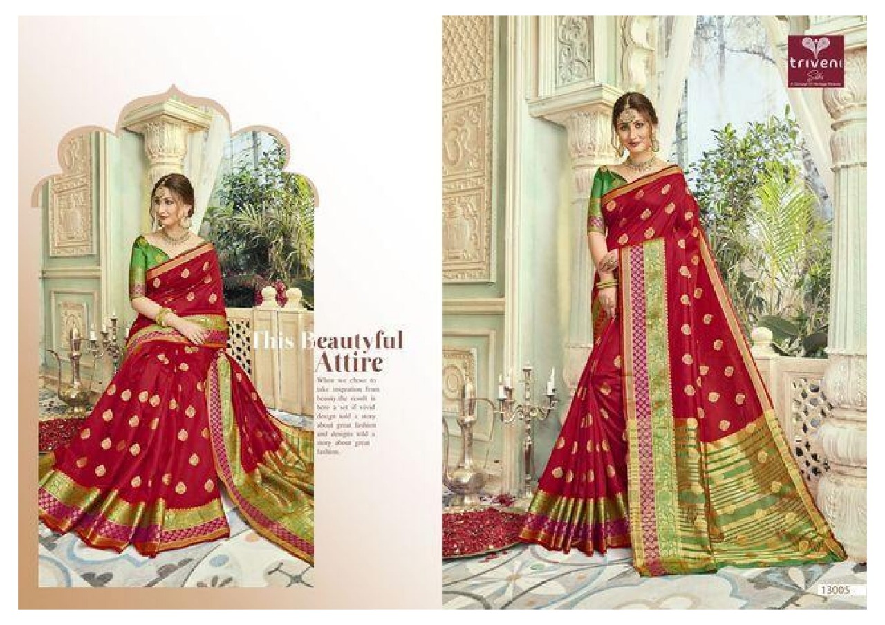 Brand - Triveni. Catlog name - Bhargavi. Rate - 726 per Pcs . Weaving silk Fabric. Set To set GST 5 Percent Extra Delivery- 2-3 DIN |