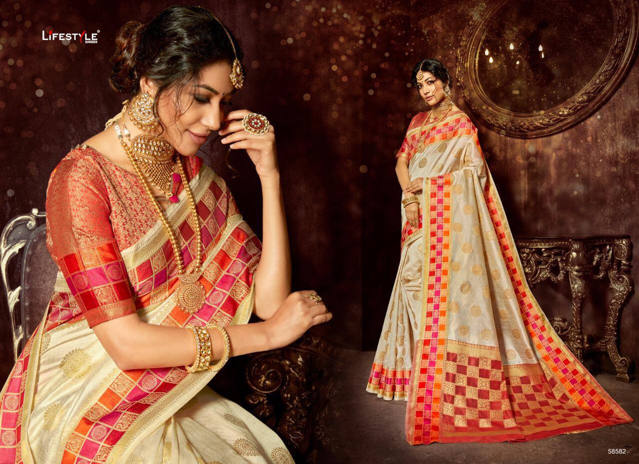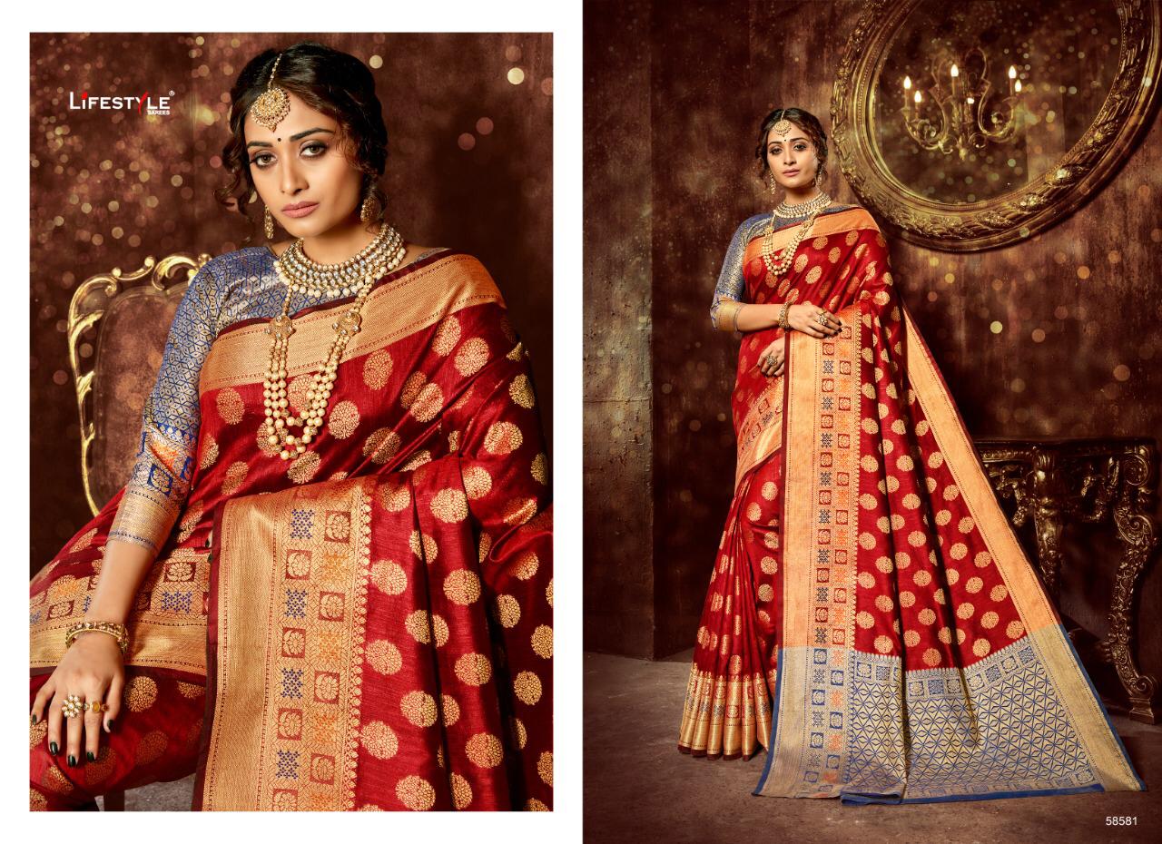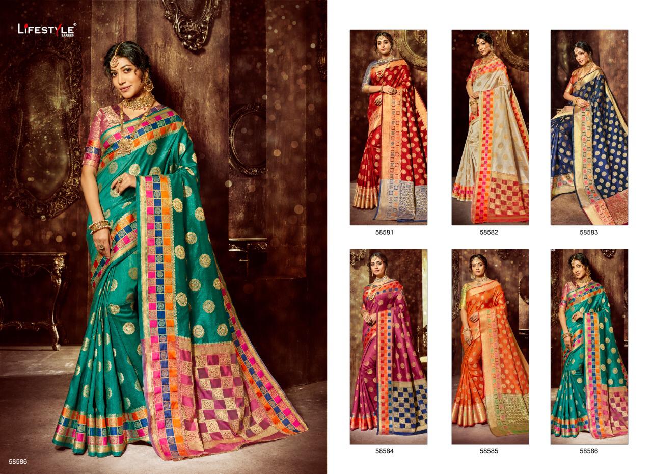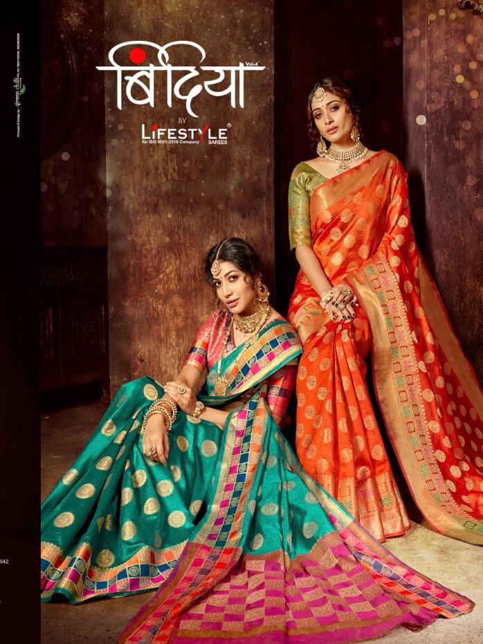 Buy Online Bindiya Vol 4 By Lifestyle 58581 Series Designer Weaving Silk Saree Collection Wholesaler Surat 6 Pcs of Full Catalogue at Wholesale Price. Looking for Bindiya Vol 4 By Lifestyle 58581 Series Designer Weaving Silk Saree Collection Wholesaler Surat Full Catalouge at Best Price? Buy Now Bindiya Vol 4 By Lifestyle 58581 Series Designer Weaving Silk Saree Collection Wholesaler Surat at Wholesale Rate of Rs 5910 with Total 6 Pcs from authroized dealer and supplier of LIFESTYLE Brand. Cost of Each piece is just only Rs 985 which is very low and affordable price to resale the product in your retail store ,This is Surat based Wholesale Supplier & Dealer of LIFESTYLE Brand. Click on Brand name to Know more about LIFESTYLE Brand's products.Call or Whatsapp on 9898838984 for booking or enquiry