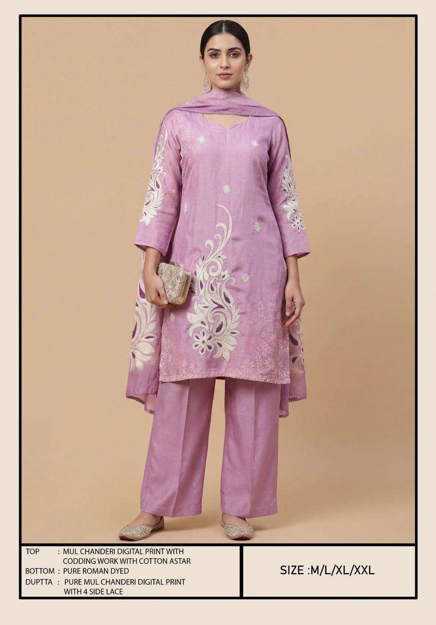 *Top* - _Mul Chanderi Digital Print With Coding Work & Cotton Astar ._ *Bottom* - _Pure Roman Dyed ._ *Dupatta* - _Pure Mul Chanderi Digital Print With 4 side Lace ._