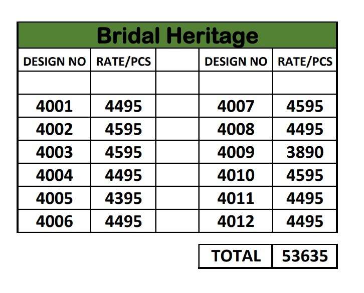 Buy Online Birdal Heritage Series 4001 To 4012 by Sulakshmi saree Collection manufacturer surat 13 Pcs of Full Catalogue at Wholesale Price. Looking for Birdal Heritage Series 4001 To 4012 by Sulakshmi saree Collection manufacturer surat Full Catalouge at Best Price? Buy Now Birdal Heritage Series 4001 To 4012 by Sulakshmi saree Collection manufacturer surat at Wholesale Rate of Rs 0 with Total 13 Pcs from authroized dealer and supplier of BRAND'S Brand. Cost of Each piece is just only Rs 0 which is very low and affordable price to resale the product in your retail store ,This is Surat based Wholesale Supplier & Dealer of BRAND'S Brand. Click on Brand name to Know more about BRAND'S Brand's products.Call or Whatsapp on 9898838984 for booking or enquiry