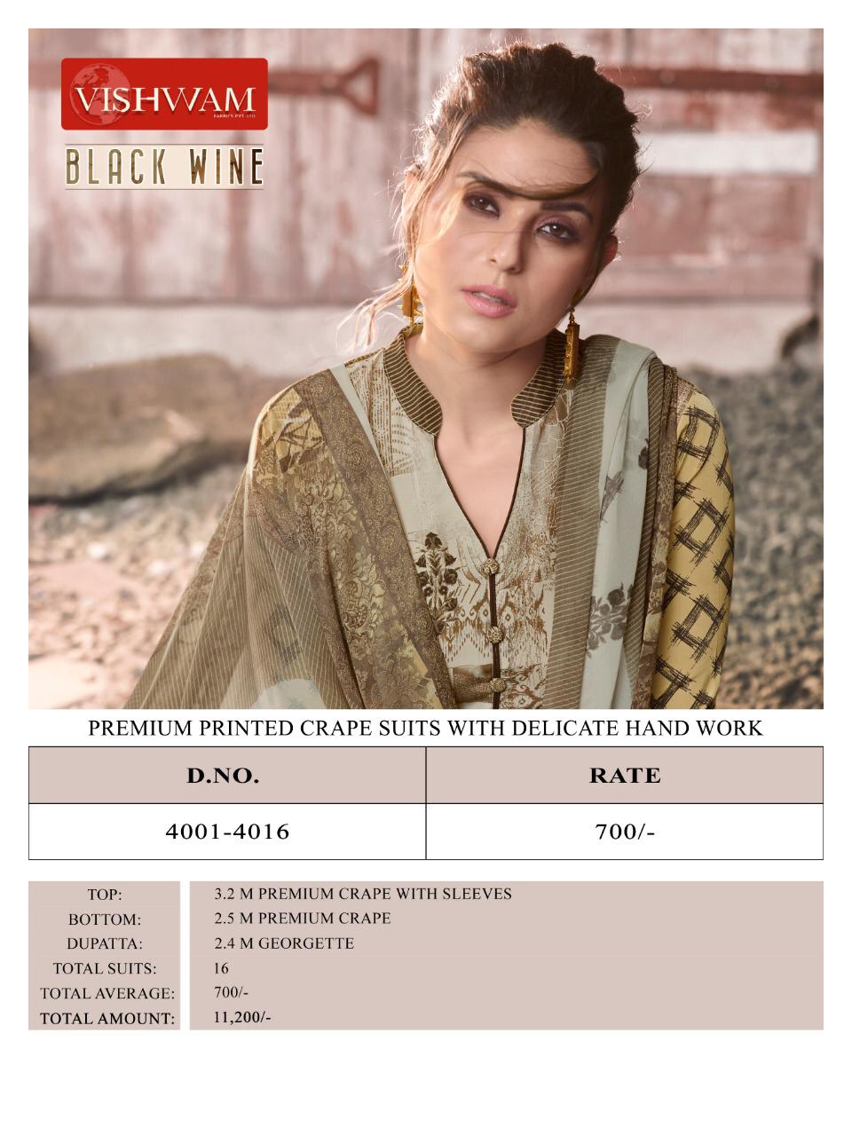 Buy Online Black Wine By Vishwam Italian Crepe Designer Suits Wholesale Supplier Gujarat 16 Pcs of Full Catalogue at Wholesale Price. Looking for Black Wine By Vishwam Italian Crepe Designer Suits Wholesale Supplier Gujarat Full Catalouge at Best Price? Buy Now Black Wine By Vishwam Italian Crepe Designer Suits Wholesale Supplier Gujarat at Wholesale Rate of Rs 11200 with Total 16 Pcs from authroized dealer and supplier of Brand. Cost of Each piece is just only Rs 700 which is very low and affordable price to resale the product in your retail store ,This is Surat based Wholesale Supplier & Dealer of Brand. Click on Brand name to Know more about Brand's products.Call or Whatsapp on 9898838984 for booking or enquiry