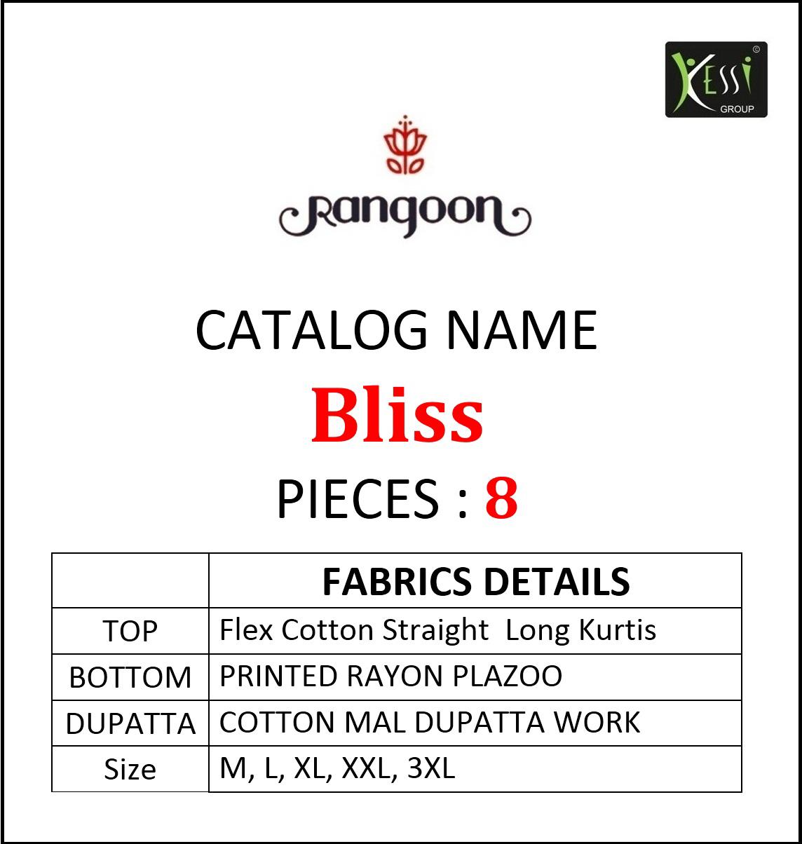 ? *Rangoon (Kessi Fabrics Pvt. Ltd.)* has launched _Catalog name_ : *Bliss* ? _Fabric Details_ ? ?Top :- Flex Cotton Straight Long Kurtis ?Bottom :- Printed Rayon Plazoo ?Dupatta :- Cotton Mal Dupatta Work ?Total Design :- 8 Rate -899 per pcs . Set to set . GST 5 Percent Extra ?Size;- M, L, XL, XXL, 3XL ?Dispatching 5 to 6 days later ?Booking started from now... ?Order yours soon.... |