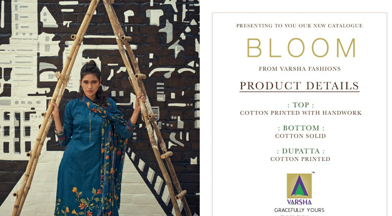 Buy Online Bloom By Varsha Cotton Dress Matarials Wholesale Supplier Gujarat 8 Pcs of Full Catalogue at Wholesale Price. Looking for Bloom By Varsha Cotton Dress Matarials Wholesale Supplier Gujarat Full Catalouge at Best Price? Buy Now Bloom By Varsha Cotton Dress Matarials Wholesale Supplier Gujarat at Wholesale Rate of Rs 9480 with Total 8 Pcs from authroized dealer and supplier of Brand. Cost of Each piece is just only Rs 1185 which is very low and affordable price to resale the product in your retail store ,This is Surat based Wholesale Supplier & Dealer of Brand. Click on Brand name to Know more about Brand's products.Call or Whatsapp on 9898838984 for booking or enquiry
