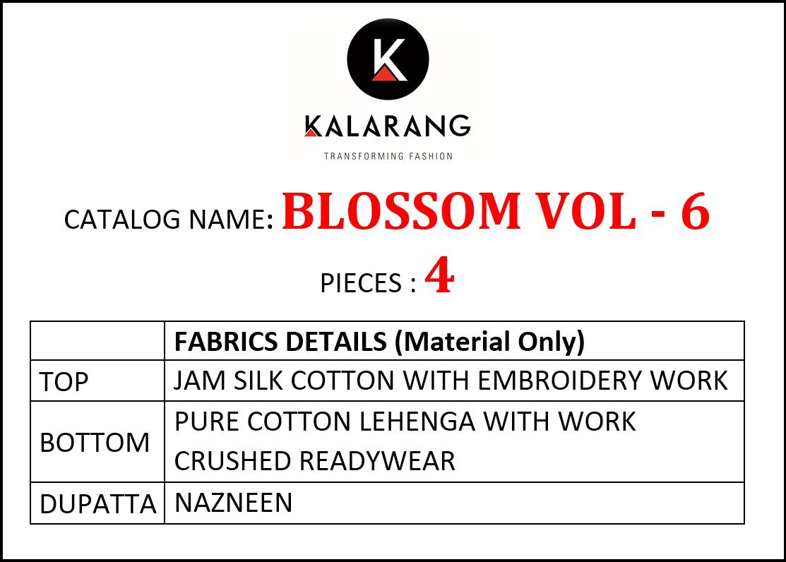 ? *Kalarang.* has launched _Catalog name_ : *BLOSSOM VOL - 6* ? _Fabric Details_ ? ?Top:- JAM SILK COTTON WITH WORK ?Bottom:- PURE COTTON LEHENGA WITH WORK CRUSHED READYWEAR ?Dupatta:- NAZNEEN ?Total Design:- 4 Rate- 899 per Pcs . Set only . GST 5 Percent Extra ?Dispatching 5 to 6 days later ?Booking started from now... ?Order yours soon.... |