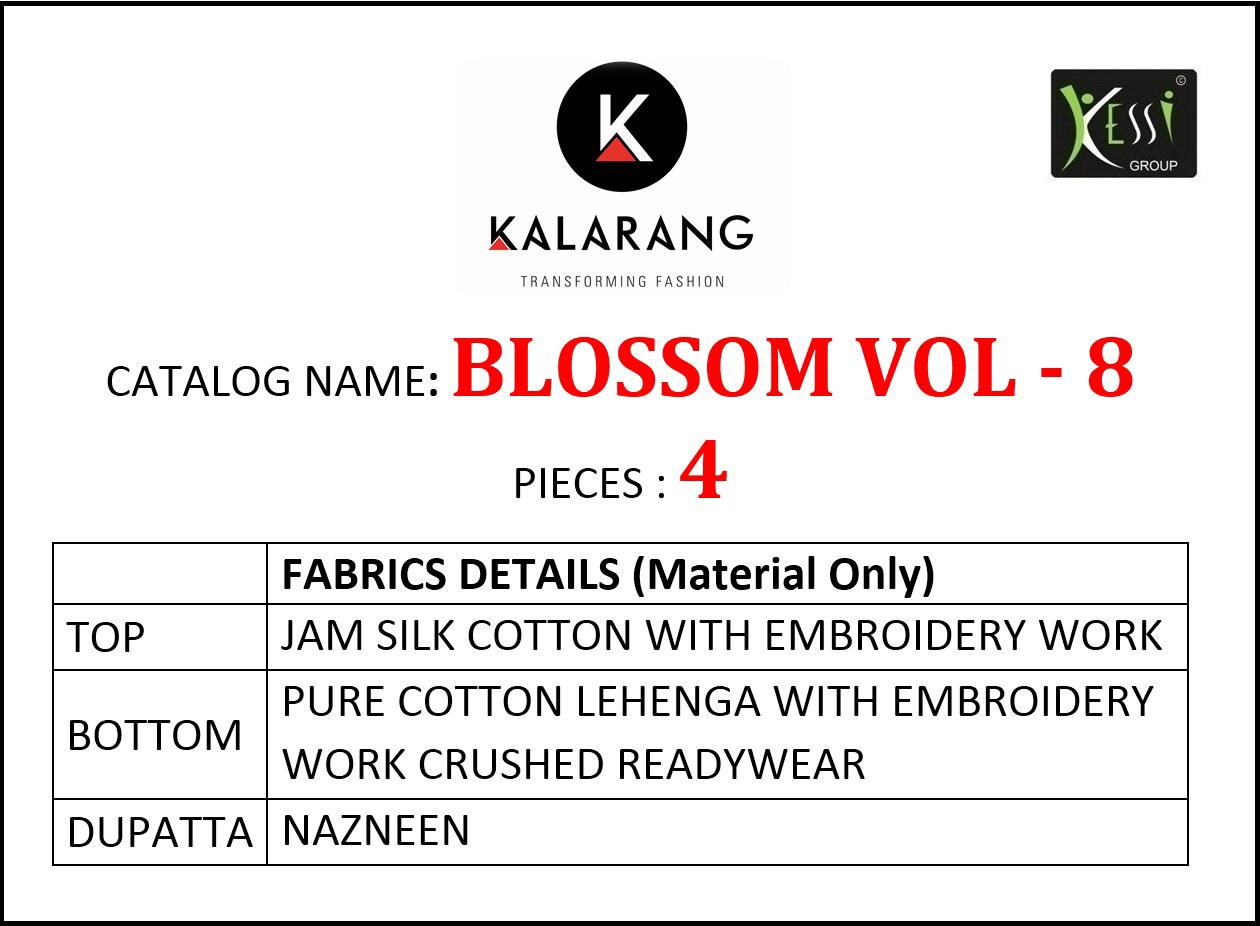 Buy Online Blossom Vol 8 By Kalarang Jam Silk Cotton Dress Materials Wholesale Supplier Surat 4 Pcs of Full Catalogue at Wholesale Price. Looking for Blossom Vol 8 By Kalarang Jam Silk Cotton Dress Materials Wholesale Supplier Surat Full Catalouge at Best Price? Buy Now Blossom Vol 8 By Kalarang Jam Silk Cotton Dress Materials Wholesale Supplier Surat at Wholesale Rate of Rs 3596 with Total 4 Pcs from authroized dealer and supplier of KALARANG Brand. Cost of Each piece is just only Rs 899 which is very low and affordable price to resale the product in your retail store ,This is Surat based Wholesale Supplier & Dealer of KALARANG Brand. Click on Brand name to Know more about KALARANG Brand's products.Call or Whatsapp on 9898838984 for booking or enquiry