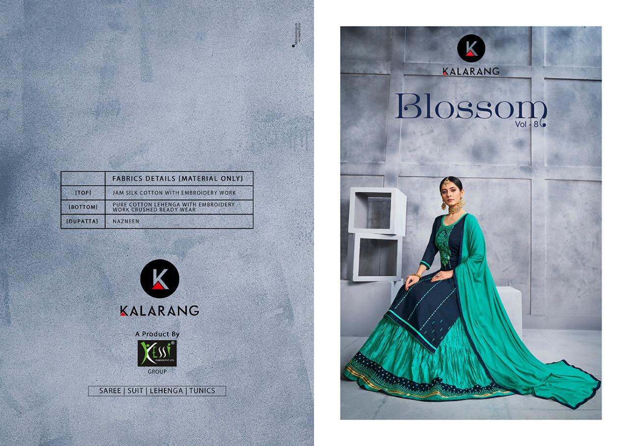 ? *Kalarang.* has launched _Catalog name_ : *BLOSSOM VOL - 8* ? _Fabric Details_ ? ?Top:- JAM SILK COTTON WITH WORK ?Bottom:- PURE COTTON LEHENGA WITH WORK CRUSHED READYWEAR ?Dupatta:- NAZNEEN ?Total Design:- 4 Rate -899 per pcs . Set To Set . GST 5 Percent Extra ?Dispatching 5 to 6 days later ?Booking started from now... ?Order yours soon.... |