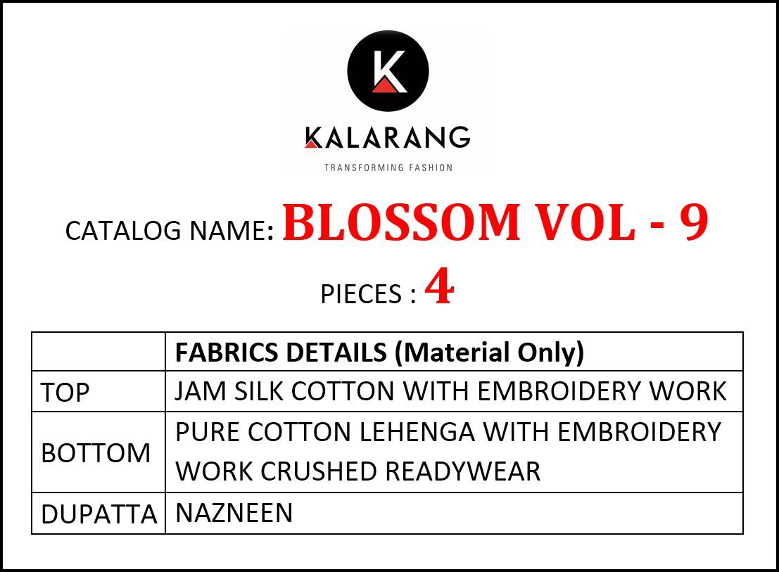 Buy Online Blossom Vol 9 By Kalarang Jam Silk Cotton Suits Wholesale Supplier Gujarat 4 Pcs of Full Catalogue at Wholesale Price. Looking for Blossom Vol 9 By Kalarang Jam Silk Cotton Suits Wholesale Supplier Gujarat Full Catalouge at Best Price? Buy Now Blossom Vol 9 By Kalarang Jam Silk Cotton Suits Wholesale Supplier Gujarat at Wholesale Rate of Rs 3596 with Total 4 Pcs from authroized dealer and supplier of KALARANG Brand. Cost of Each piece is just only Rs 899 which is very low and affordable price to resale the product in your retail store ,This is Surat based Wholesale Supplier & Dealer of KALARANG Brand. Click on Brand name to Know more about KALARANG Brand's products.Call or Whatsapp on 9898838984 for booking or enquiry