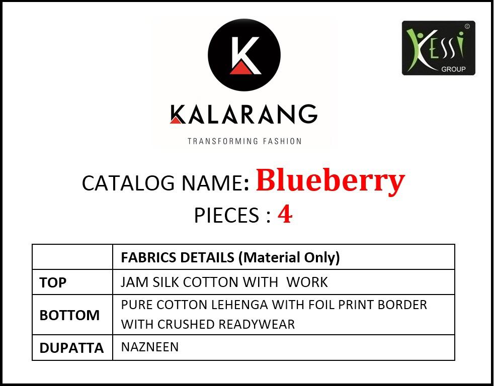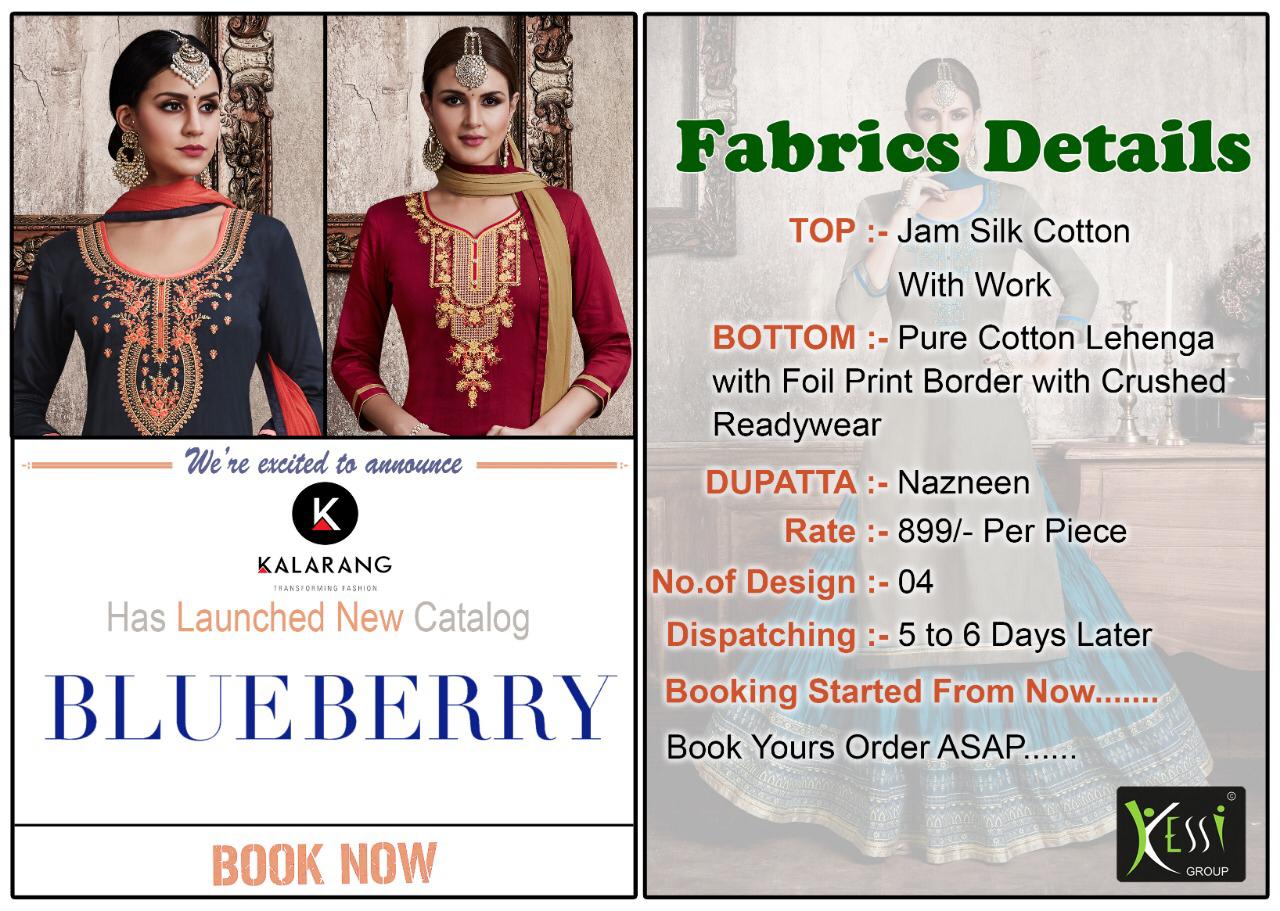 ? *Kalarang.* has launched _Catalog name_ : *Blueberry* ? _Fabric Details_ ? ?Top :- JAM SILK COTTON WITH WORK ?Bottom:- PURE COTTON LEHENGA WITH FOIL PRINT BORDER WITH CRUSHED READYWEAR ?Dupatta:- NAZNEEN ?Total Design :- 4 Rate -799 per Pcs . Set To Set. GST 5 Percent Extra. ?Dispatching 5 to 6 days later ?Booking started from now... ?Order yours soon.... |