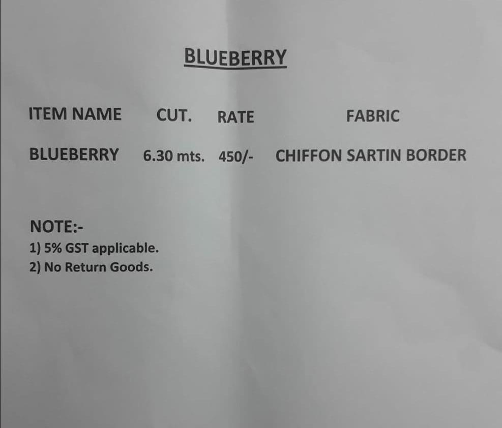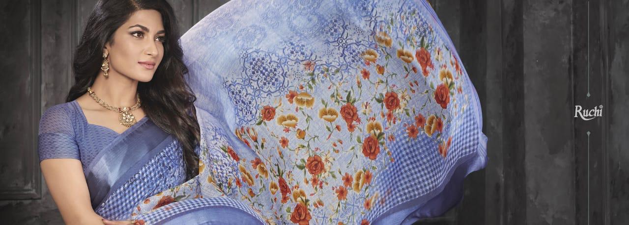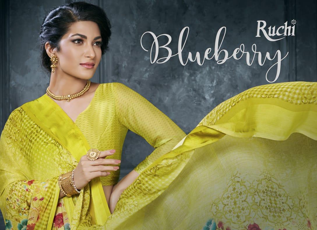 Ruchi Sarees 1). Blueberry 2). No. of pcs.- 20 3). Packing- setwise only Brand - RUCHI . Catlog name - BLUEBERRY. Set To Set. GST 5 Percent Extra. Delivery 2 days |