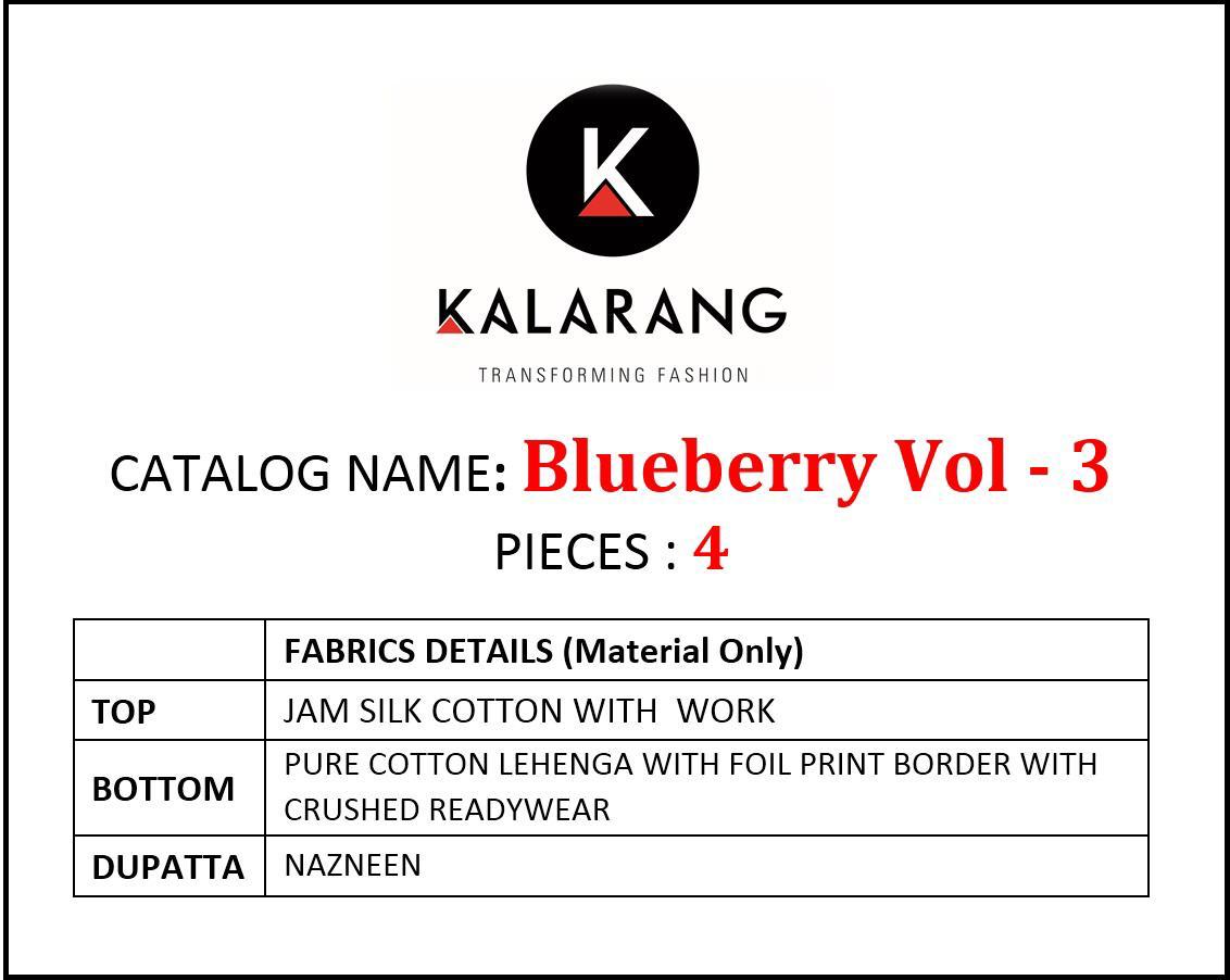 Buy Online Blueberry Vol 3 By Kalarang Jam Silk Cotton Suits Wholesale Supplier Gujarat 4 Pcs of Full Catalogue at Wholesale Price. Looking for Blueberry Vol 3 By Kalarang Jam Silk Cotton Suits Wholesale Supplier Gujarat Full Catalouge at Best Price? Buy Now Blueberry Vol 3 By Kalarang Jam Silk Cotton Suits Wholesale Supplier Gujarat at Wholesale Rate of Rs 3596 with Total 4 Pcs from authroized dealer and supplier of KALARANG Brand. Cost of Each piece is just only Rs 899 which is very low and affordable price to resale the product in your retail store ,This is Surat based Wholesale Supplier & Dealer of KALARANG Brand. Click on Brand name to Know more about KALARANG Brand's products.Call or Whatsapp on 9898838984 for booking or enquiry