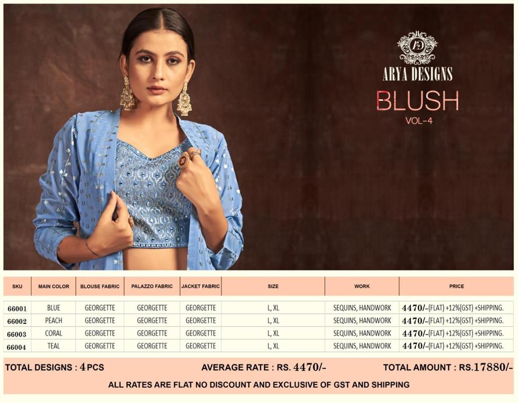 Buy Online Blush Vol 4 By Arya Designs Fancy Georgette Western Wear Collection Manufacturer Surat 4 Pcs of Full Catalogue at Wholesale Price. Looking for Blush Vol 4 By Arya Designs Fancy Georgette Western Wear Collection Manufacturer Surat Full Catalouge at Best Price? Buy Now Blush Vol 4 By Arya Designs Fancy Georgette Western Wear Collection Manufacturer Surat at Wholesale Rate of Rs 17880 with Total 4 Pcs from authroized dealer and supplier of Brand. Cost of Each piece is just only Rs 4470 which is very low and affordable price to resale the product in your retail store ,This is Surat based Wholesale Supplier & Dealer of Brand. Click on Brand name to Know more about Brand's products.Call or Whatsapp on 9898838984 for booking or enquiry